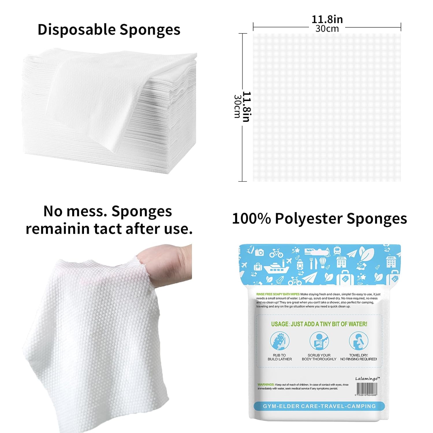 Wipes Size and Quantity: The dimensions of no rinse wipes are an ample 11.8 inches by 11.8 inches. Each resealable pack holds 25 pre-soaped bathing wipes.