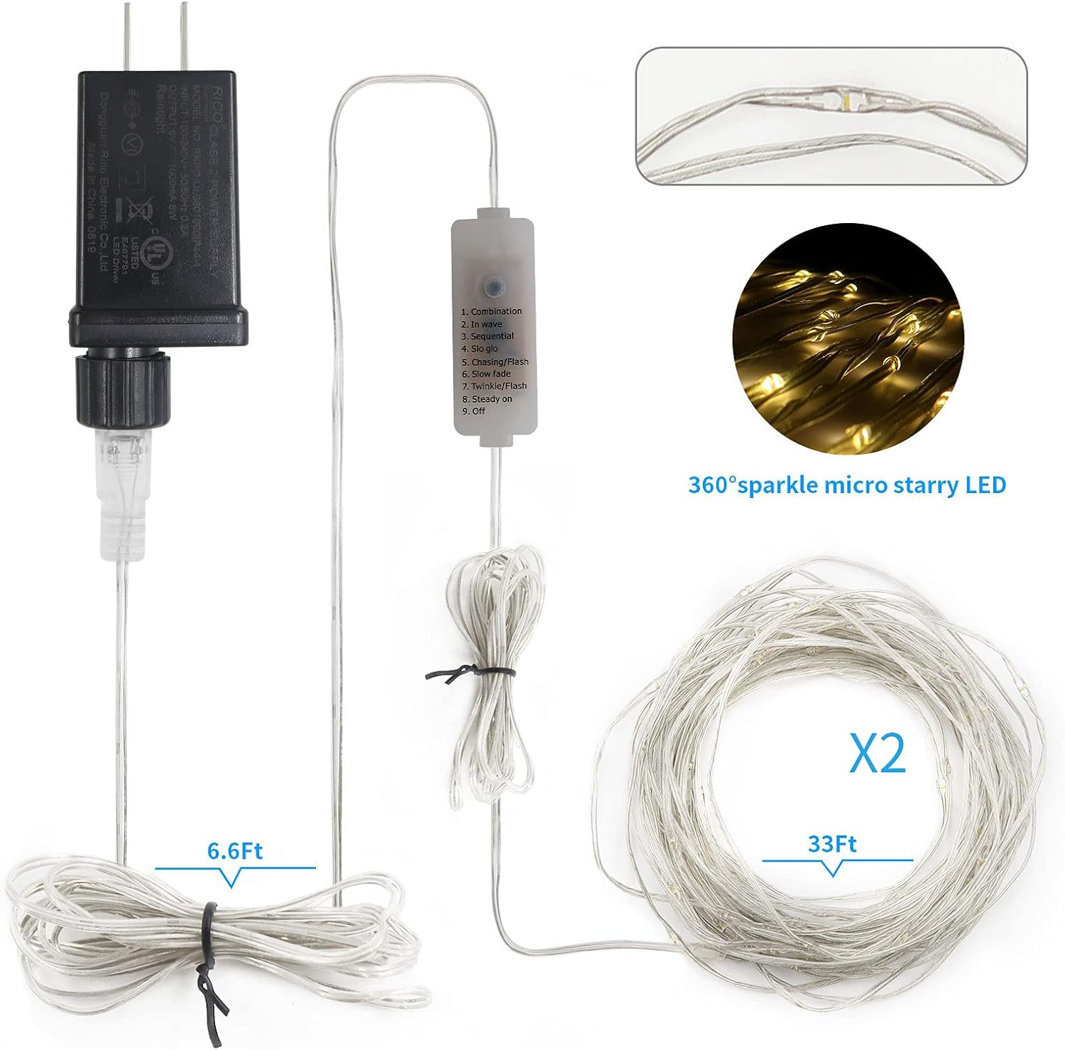 [Christmas Lights String] 2 packs of 33 Ft 100 LED warm white string lights, 4 inches distance between each 360°sparkle Low voltage micro starry LED bead. It’s bright and safe