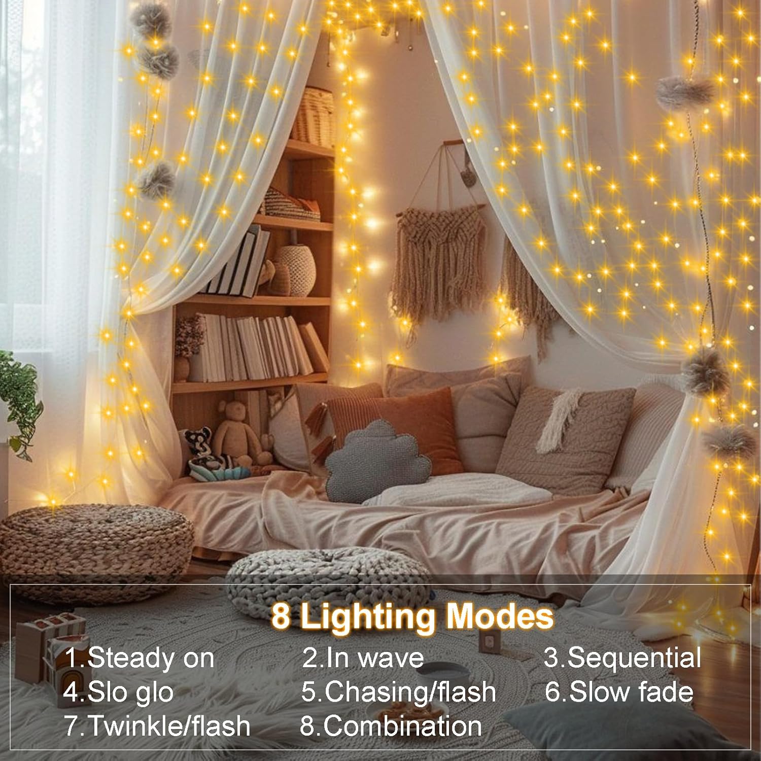 [Multi-function Remote] 8 Modes – Combination, In wave, Sequential, Slo glo, Chasing/Flash, Slow fade, Twinkle/Flash, Steady on. Timer – 6 hours on and 18 hours off. Dimmable, you could adjust the brightness of the string lights to meet your needs
