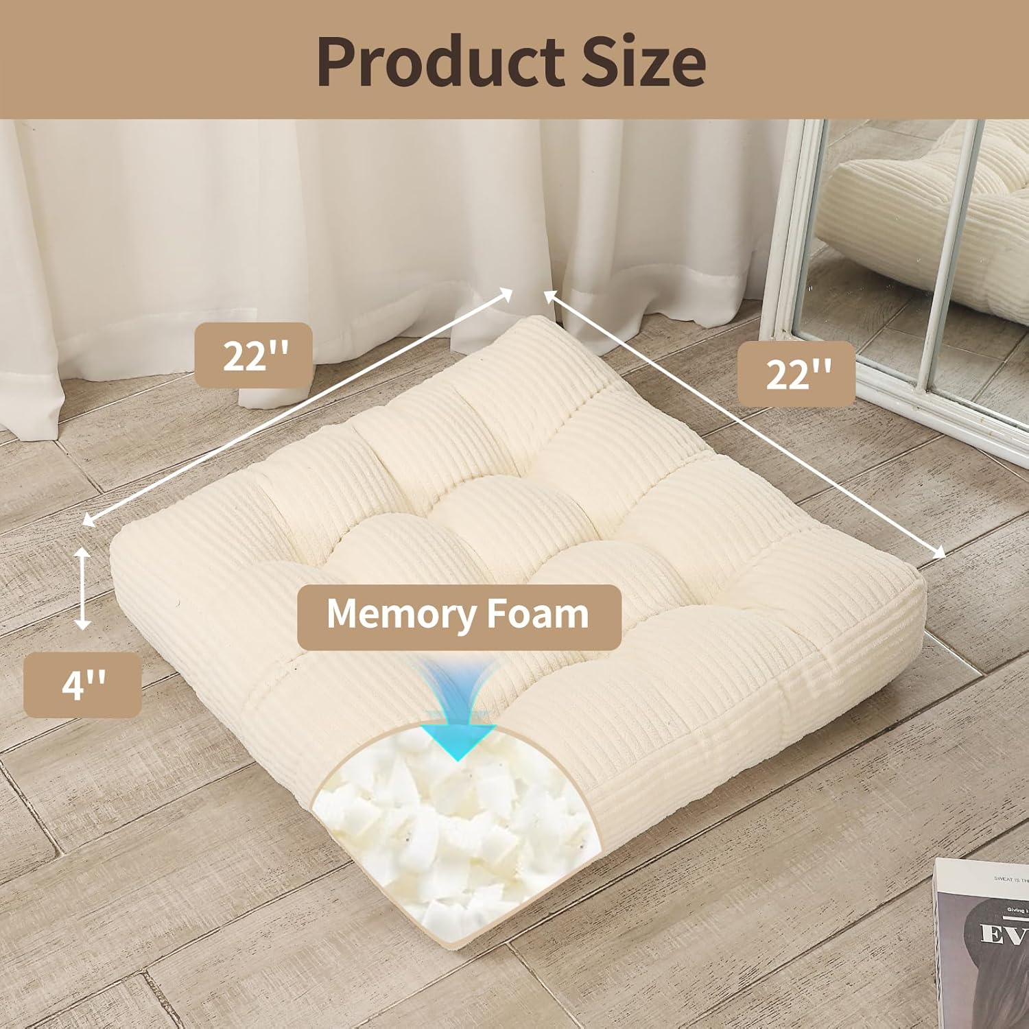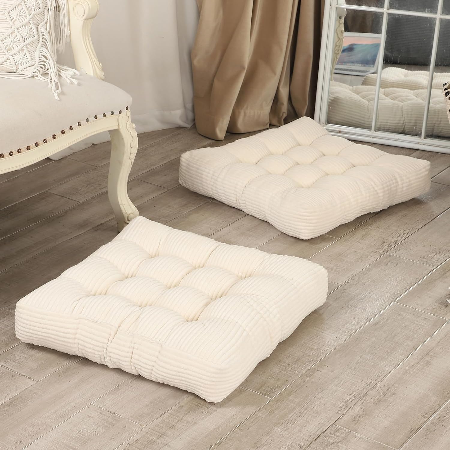 22 inches Meditation Pillow, 2 Pack Square Large Floor Cushions for Adults, Thick Corduroy Floor Pillows for Sitting, Yoga, Living Room, Sofa, Tatami, Beige