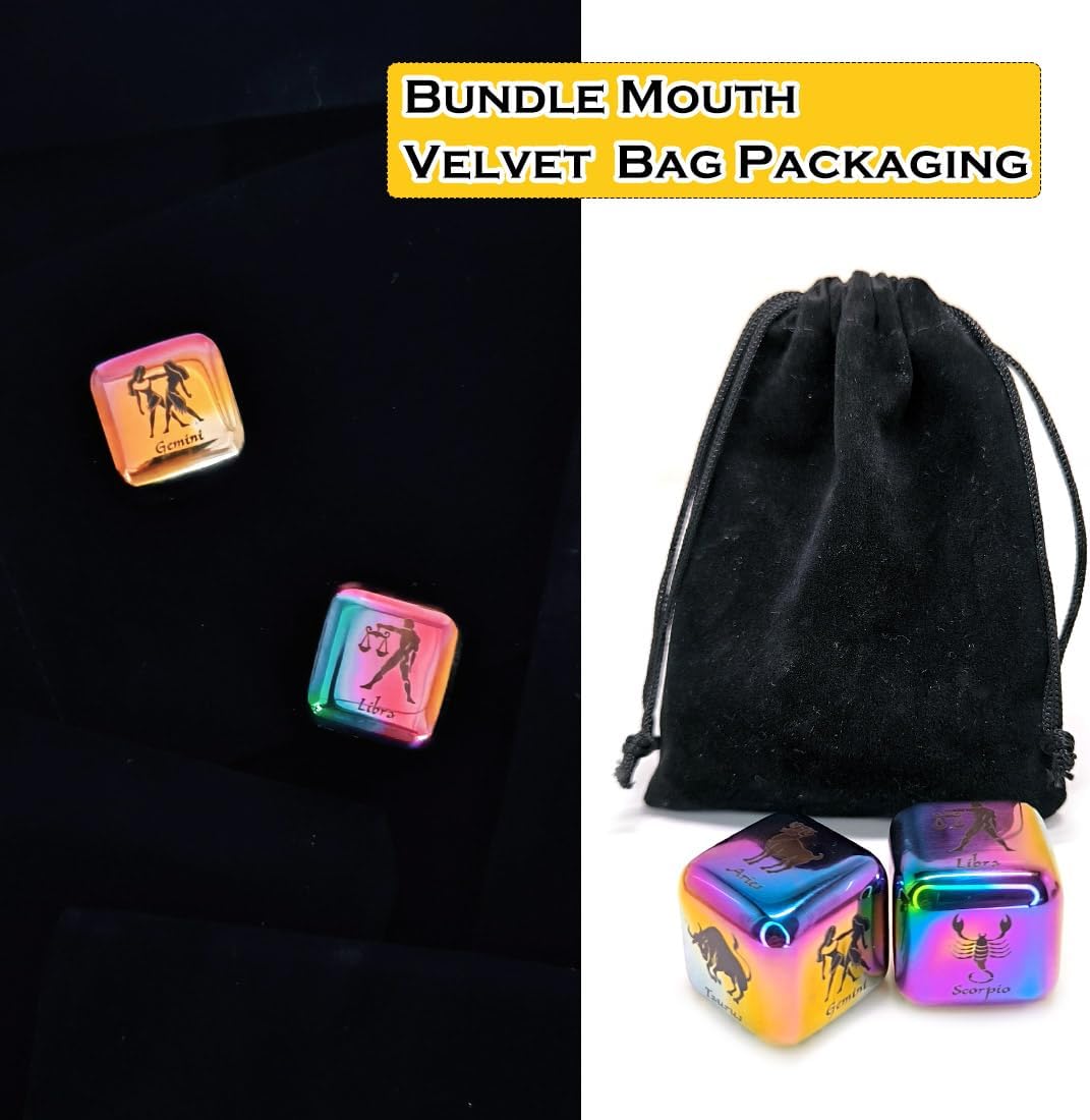 Product Name: Stainless Steel Zodiac 12 Constellation Dice Set Set Content: 2(1Pair) X 27MM Dices+1 X Bundle Mouth Linen Bag Dice Material: Stainless Steel Dice Size: 27MM(1IN)X27MM(1IN)X27MM(1IN) Engraving Technology: Precision Laser Engraving Machine Firing Embark on a journey through the cosmic wonders of the Zodiac with our exclusive Zodiac Dice Set. This unique collection of dice offers a fascinating blend of astrological charm and practical functionality. Each die in this set showcases a distinct Zodiac sign, ensuring that all 12 signs are represented with just two dice. The precision laser engraving technique captures the intricate details of each Zodiac symbol, imprinting them onto the surface of the stainless steel dice. These laser-engraved patterns are fadeless and long-lasting, ensuring that your dice will retain their beauty and readability for years to come. Crafted from premium stainless steel, these dice are both lightweight and durable. The hollow interior design ensures a comfortable grip, while the polished surface creates a mirror-like finish that elevates the dice to the level of a true work of art. Boasting a side length of 1 inch (2.7cm), these dice offer a larger display area compared to traditional dice. This increased size not only accommodates more complex patterns but also ensures that the Zodiac symbols are easily readable, making them perfect for both gaming and display purposes. Versatile and convenient, this Zodiac Dice Set is an ideal choice for astrology enthusiasts. Use it to add a cosmic touch to your gaming sessions, make predictions, or simply display it as a unique decorative accent. The included drawstring Velvet Bag provides easy storage and portability, making it a thoughtful gift for anyone who appreciates the wonders of the universe.