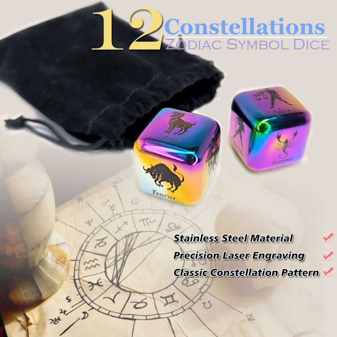 Unique Zodiac Dice Set: Embark on an astrological adventure with this exceptional dice set. Each cubic die showcases one of the 12 Zodiac signs on its six faces, allowing you to explore the full spectrum of star signs with just two dice. Ideal for gaming, divination, or simply adding a cosmic touch to your daily routine.