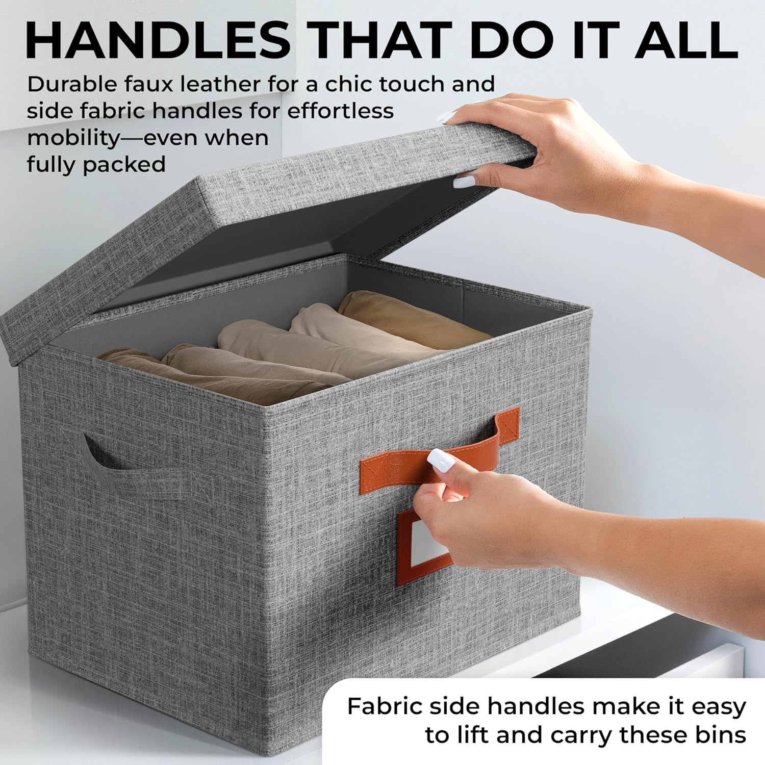 DECLUTTER WITH STYLE with the Clutter Cure Fabric Storage Cubes with Lids. The faux leather handle gives it a polished touch, while side fabric grips ensure you can lift, stack, and move your rectangle closet storage bins with lids for clothes, books, or seasonal essentials