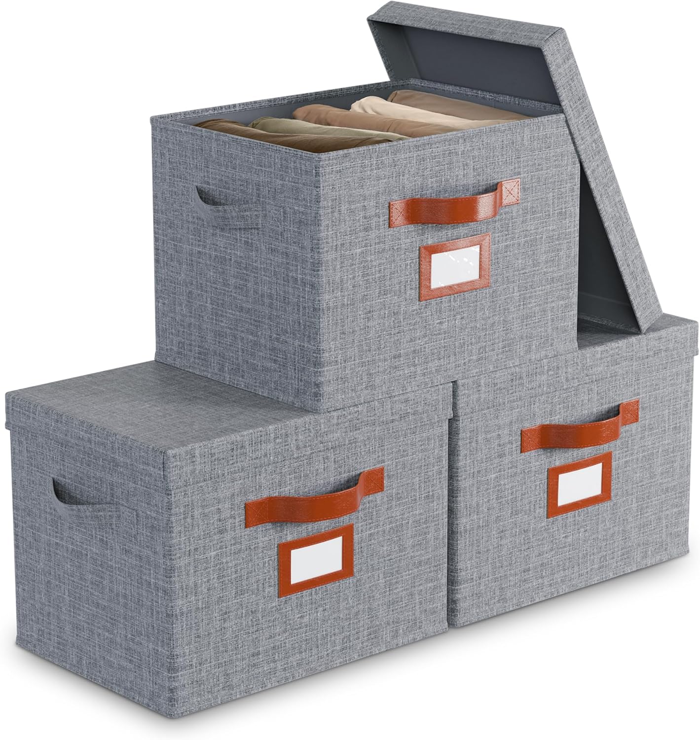 1 review for 3 Pack Large Fabric Storage Bins with Lid – Decorative Box with Lid, Label Holder, Faux Handles – Large Decorative Storage Boxes with Lids for Organizing Clothes, Blankets – Steel Gray