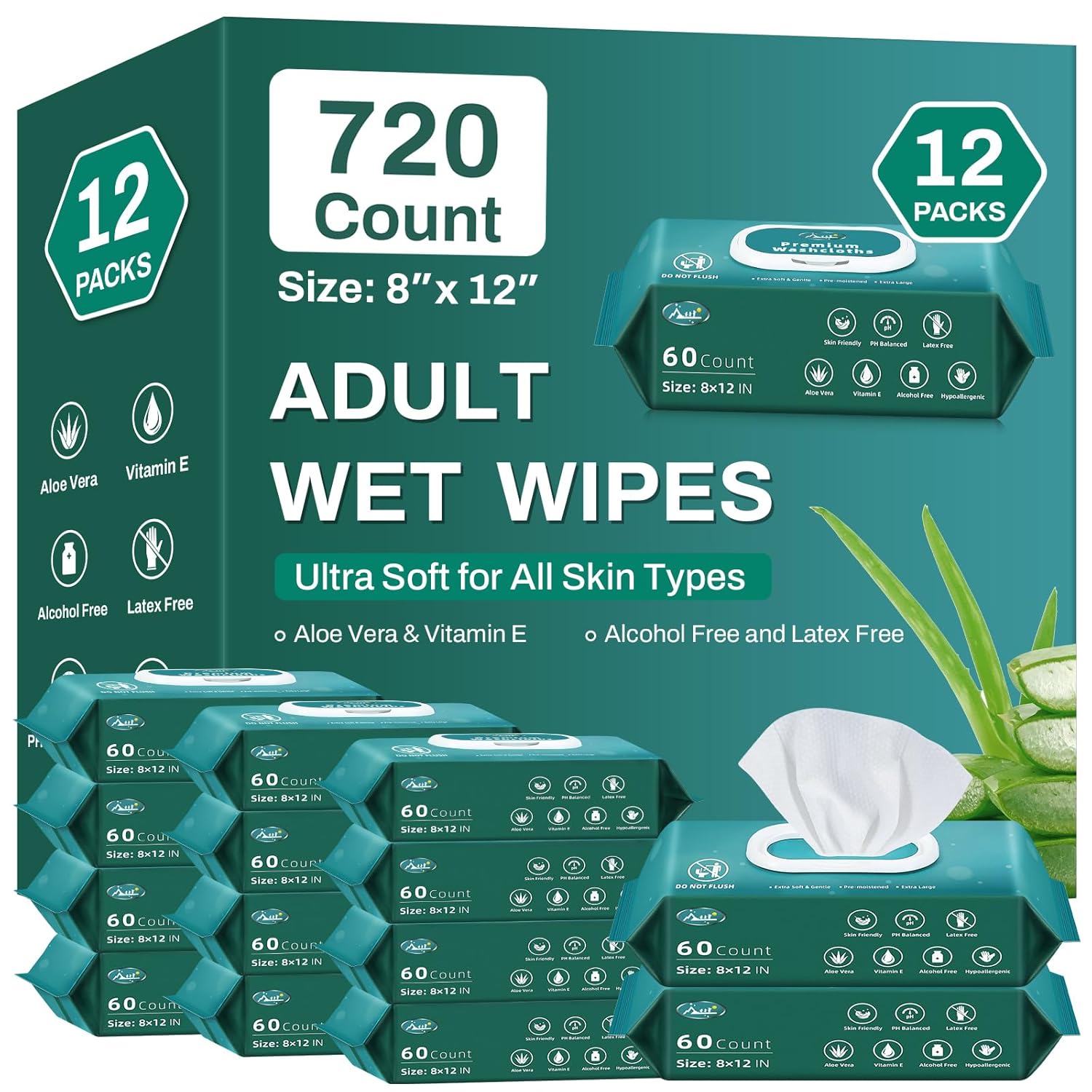 [720 Count, 12 Packs of 60] Wet Wipes for Adults, 12″ x 8″ Large Disposable Washcloths for Incontinence & Cleansing, Body Wipes Bath Wipes – Disposable Washcloths for Elderly