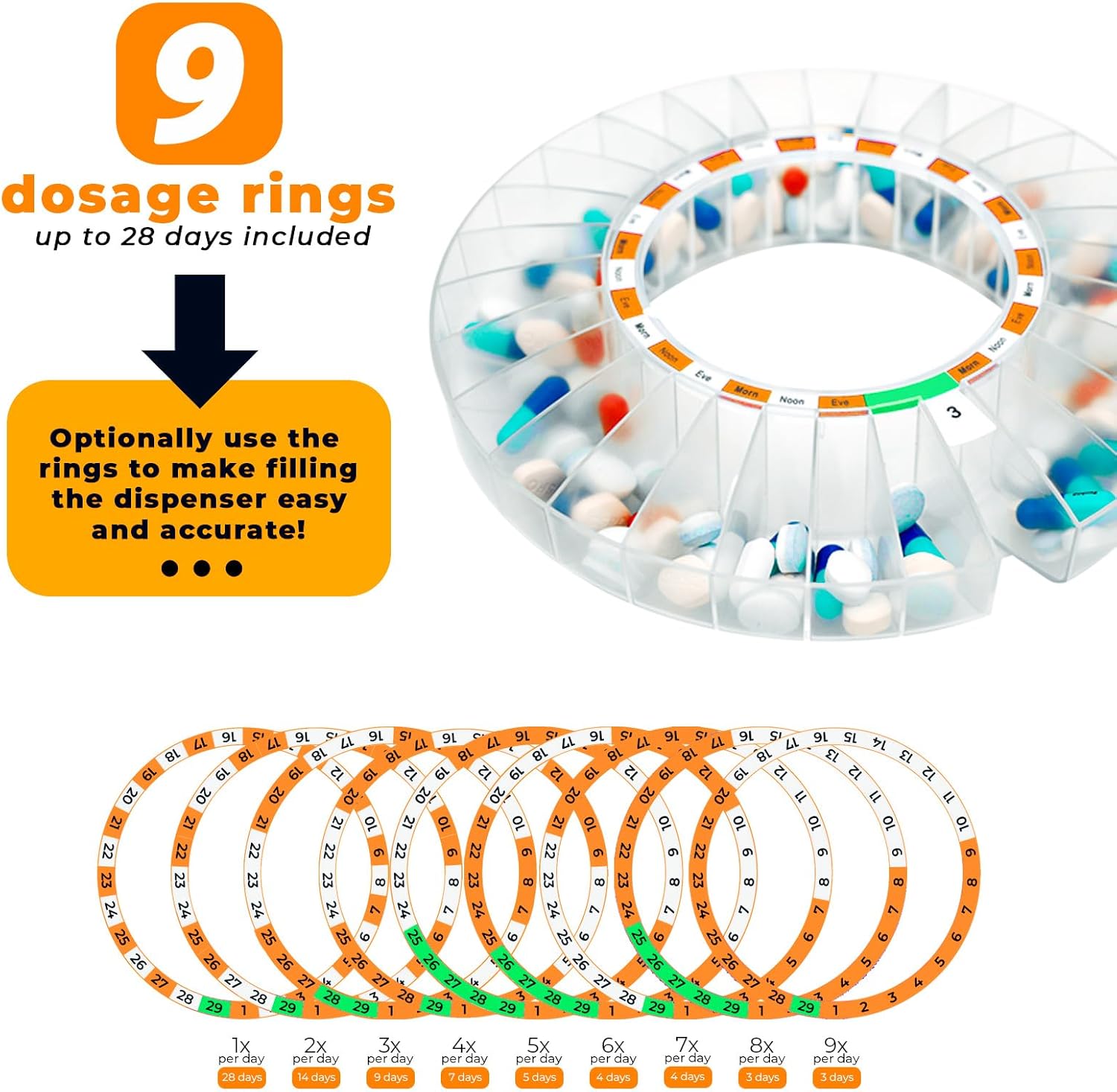 EFFORTLESSLY EASY SETUP: Get started with ease using our free app, ensuring a hassle-free experience for both caregivers and elderly patients. We also include 9 different dosage rings, each corresponding to the required daily intake, up to 28 days. Simply place the desired dosage ring in the daily pill box organizer and start filling the compartments with meds. Then, in the app, you can effortlessly set the specific times for each dosage to be offered, allowing for precise medication management.
