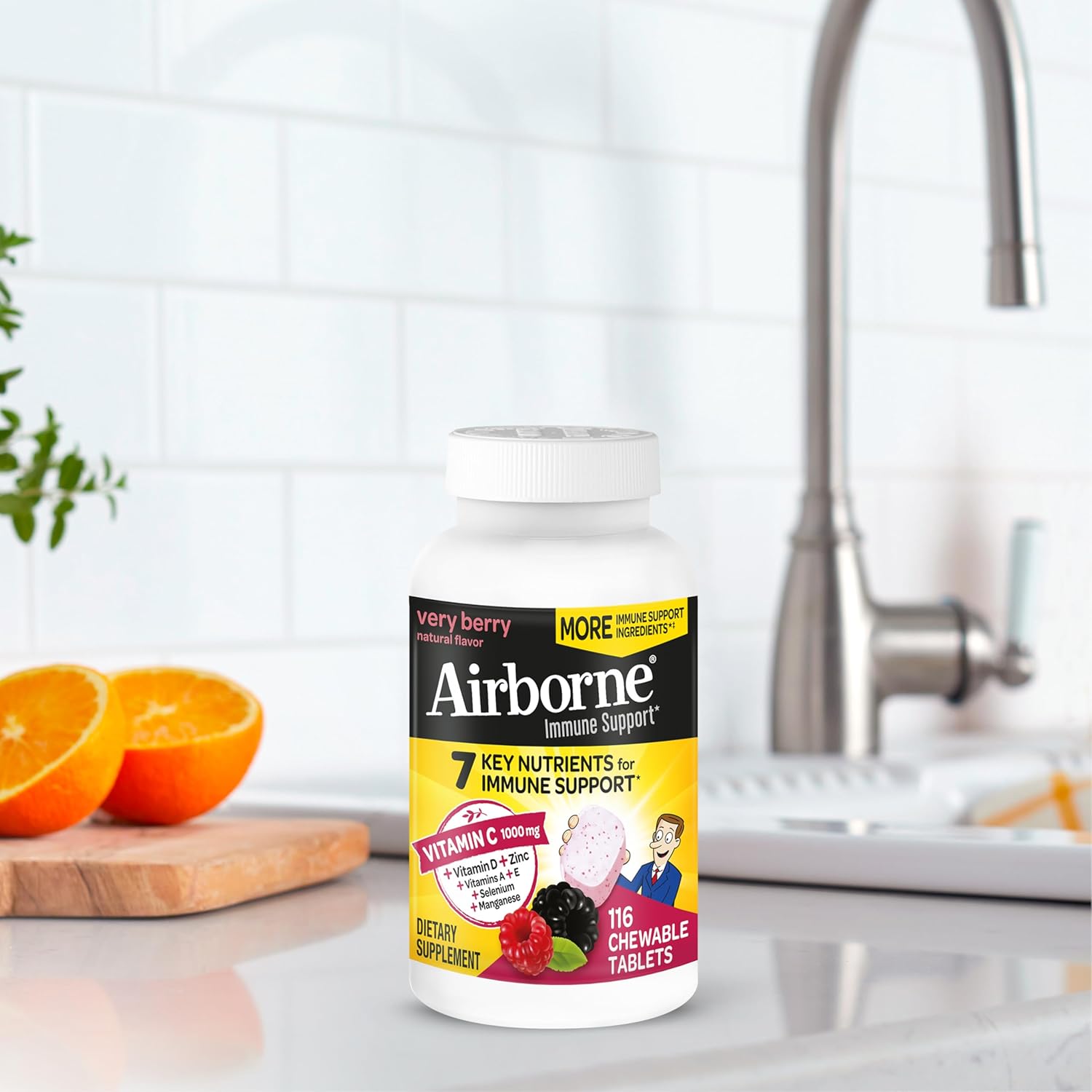 “VITAMIN C 1000mg: Airborne immune support chewable tablets are packed with 1000mg Vitamin C per serving, which helps support your immune system. ZINC SUPPLEMENT: These Vitamin C with Zinc chewable tablets NOW contain 100 percent of your daily value of Zinc, which plays a central role in your immune system and is essential for the functioning and signaling of immune cells. VITAMIN D SUPPLEMENTS: These tablets NOW contain 15000IU of Vitamin D3, important for proper functioning of the immune system*. POWERFUL ANTIOXIDANTS: Airborne immune support tablets contains the antioxidants Vitamin A to support immune health, Vit C to support immune health, Vitamin E to help fight free radicals, and Zinc to help maintain healthy immune cells. COMPLETE FORMULA: This crafted blend of 7 immune support vitamins is our most complete immune support formula yet.* It comes with minerals & herbs and it is an excellent source of Zinc and Selenium. NUMBER ONE IMMUNE SUPPORT EFFERVESCENT BRAND: Airborne is the Number 1 Immune Support Gummy, Effervescent & Chewable Brand (Based on unit sales L52W through 7/24/2024). GLUTEN FREE: Airborne Immune Support Chewable Tablets are Gluten Free, None-GMO, Caffeine Free, and manufactured in the USA with ingredients sourced globally. TASTY & TRAVEL-FRIENDLY: Add these tasty very-berry-flavored chewable tablets to your travel essentials. These Vitamin C tablets are convenient and easy for adults and for kids 14plus to take at home or on the go. *These statements have not been evaluated by the Food and Drug Administration. This product is not intended to diagnose, treat, cure or prevent any disease.”