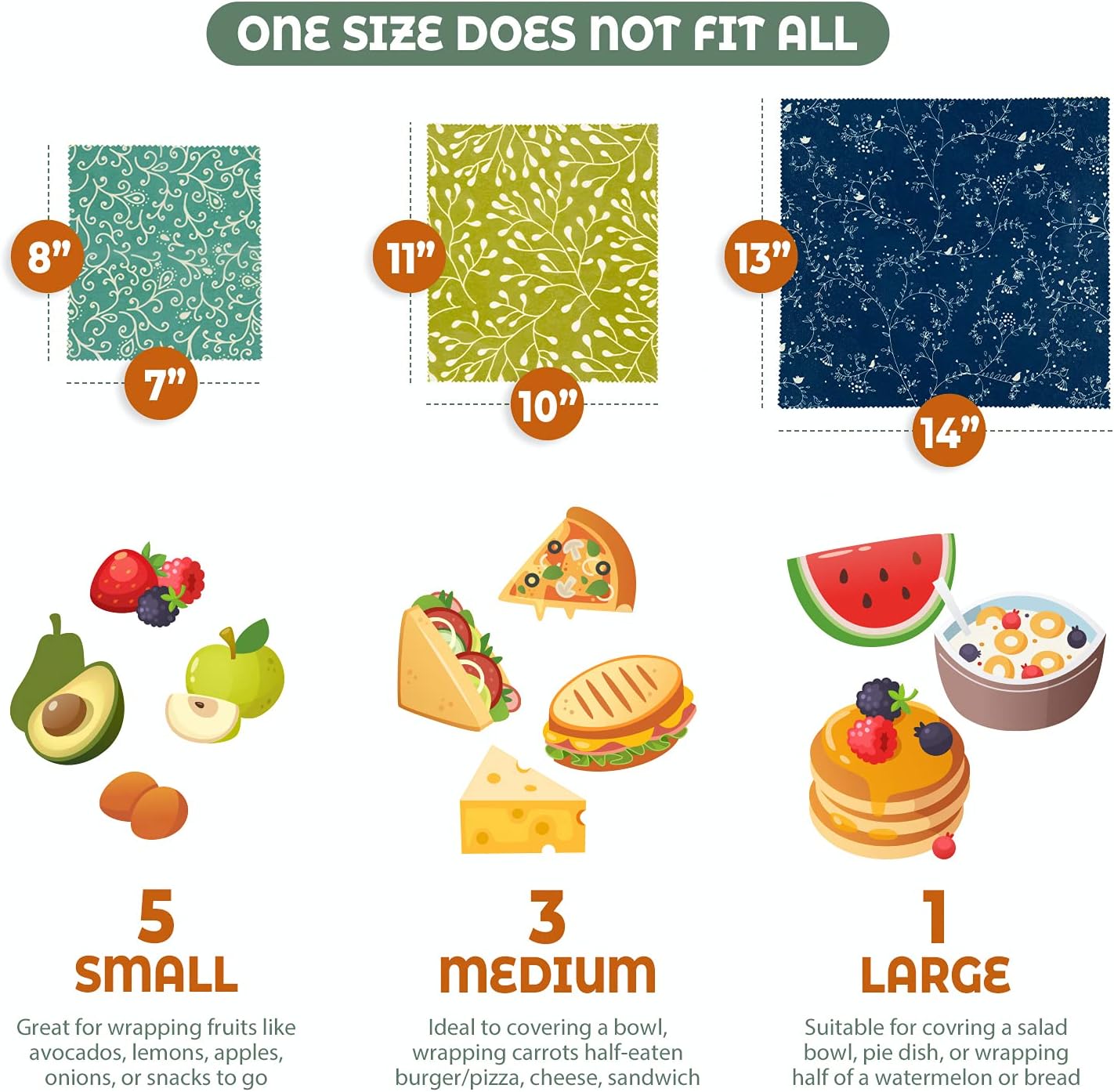One Size Does Not Fit All: Size and quantity matter! Our design is three times more than the popular quantity and sizes for your daily uses. 9-PACK includes 5 Small (7″ x 8″), 3 Medium (10″ x 11″), and 13″ x 14″) wraps. Different sizes can cover different foods depending on your needs.