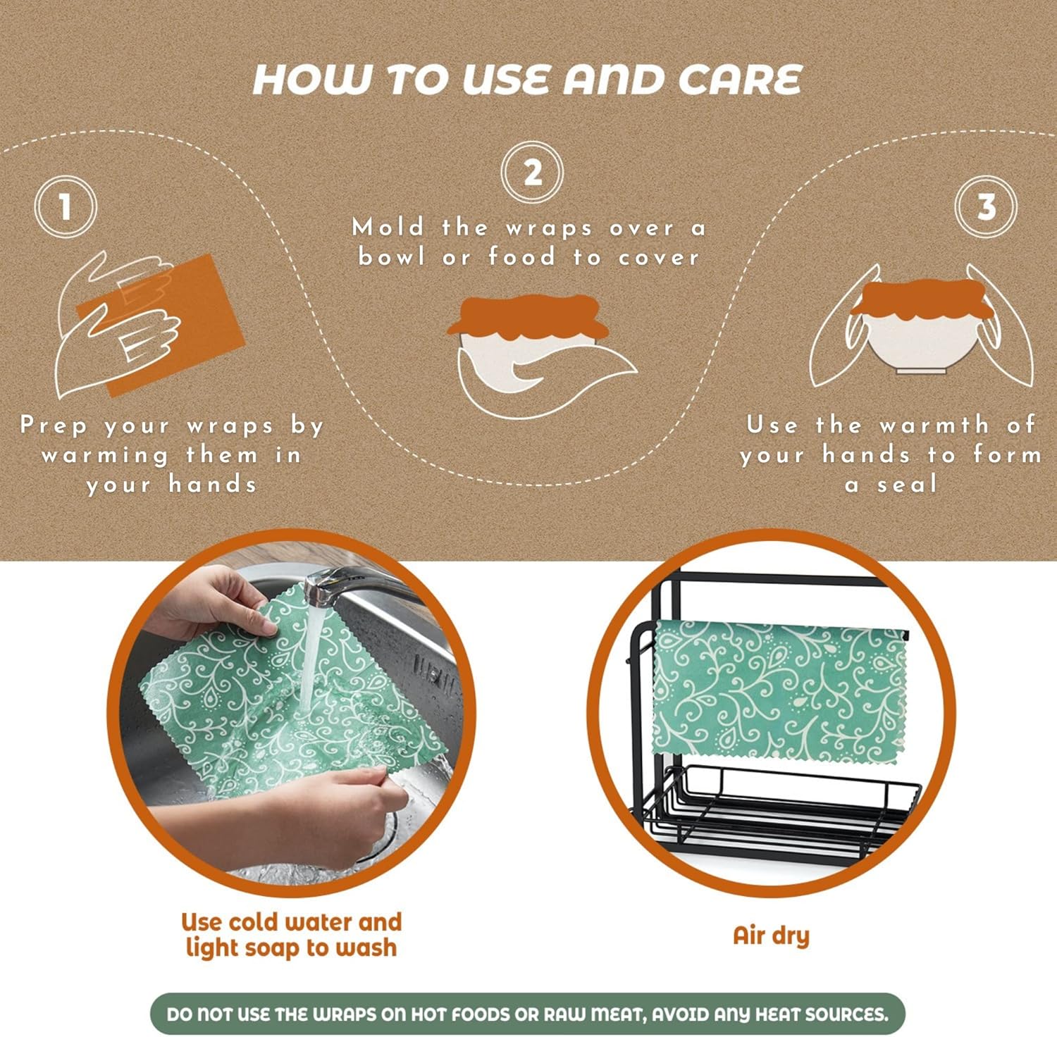 Easy To Wash, Reusable – Use the warmth of your hands to soften the wrap and form over a container or piece of food. Wash in cool water with mild soap and air dry. Keep food wraps away from heat and don’t put them in the dryer. The properties of beeswax and jojoba oil help keep food fresher and allow food wraps to be used again and again.