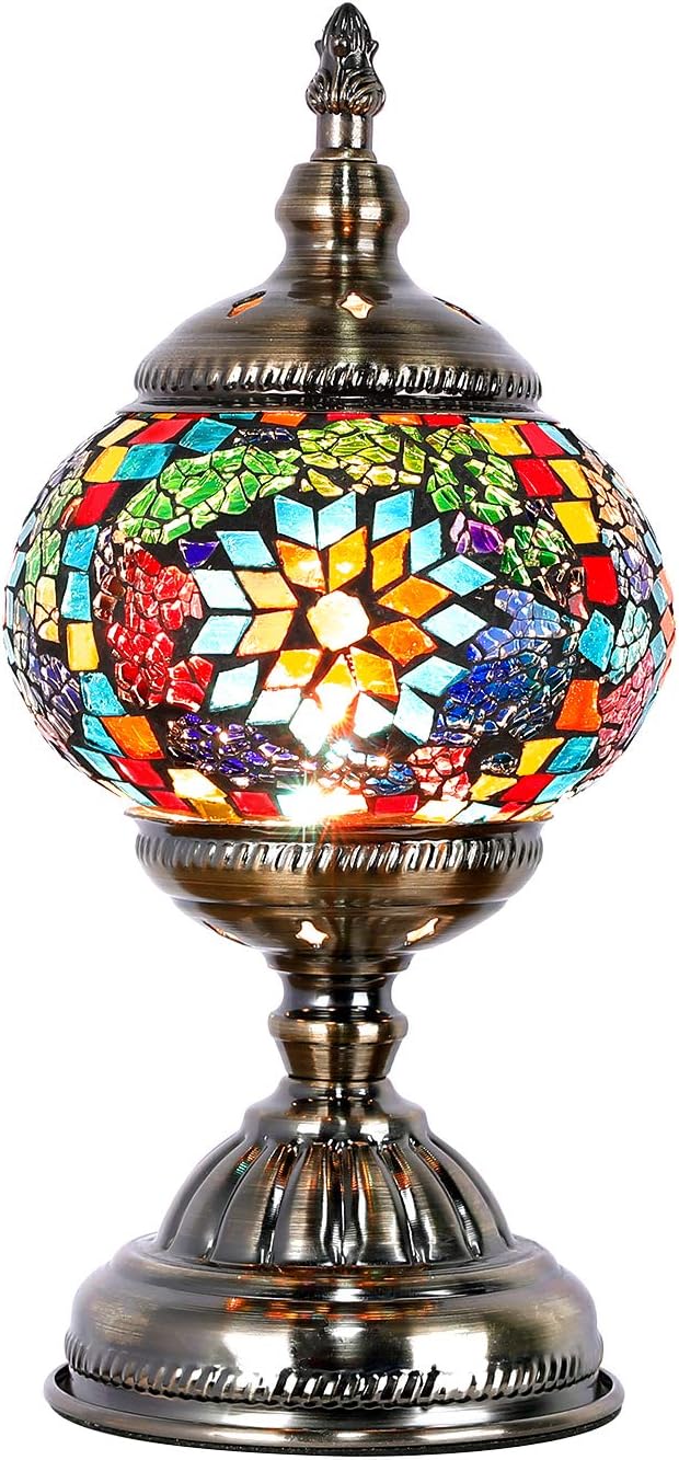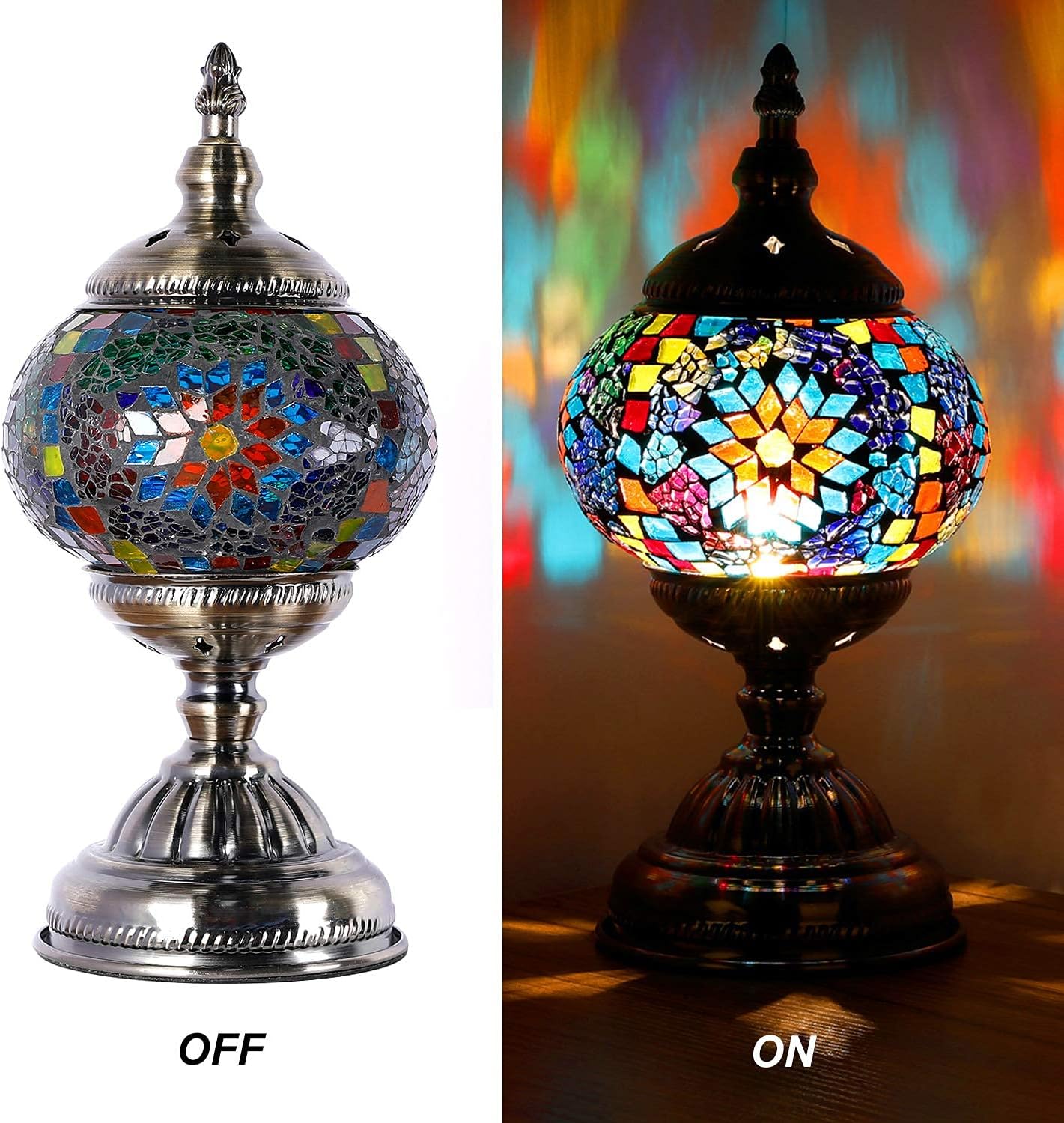 Handmade Turkish Mosaic Table Lamp Craftsmen use colorful mosaic glass to create beautiful patterns on lampshades. Mosaic lampshades take a lot of time and effort. Each lamp is unique. Using High-Quality Materials and CE Certified Power Cords UK plug ON/OFF Switch. The colorful glass shade and antique bronze base. Come with one E12 LED bulb, easy to Use and Install. Turkish lamps have a vintage look and create invites to relax and rest ambient. also makes an excellent gift for birthdays, Christmas, and other special occasions. Enjoy your cool Tiffany-style lamp!