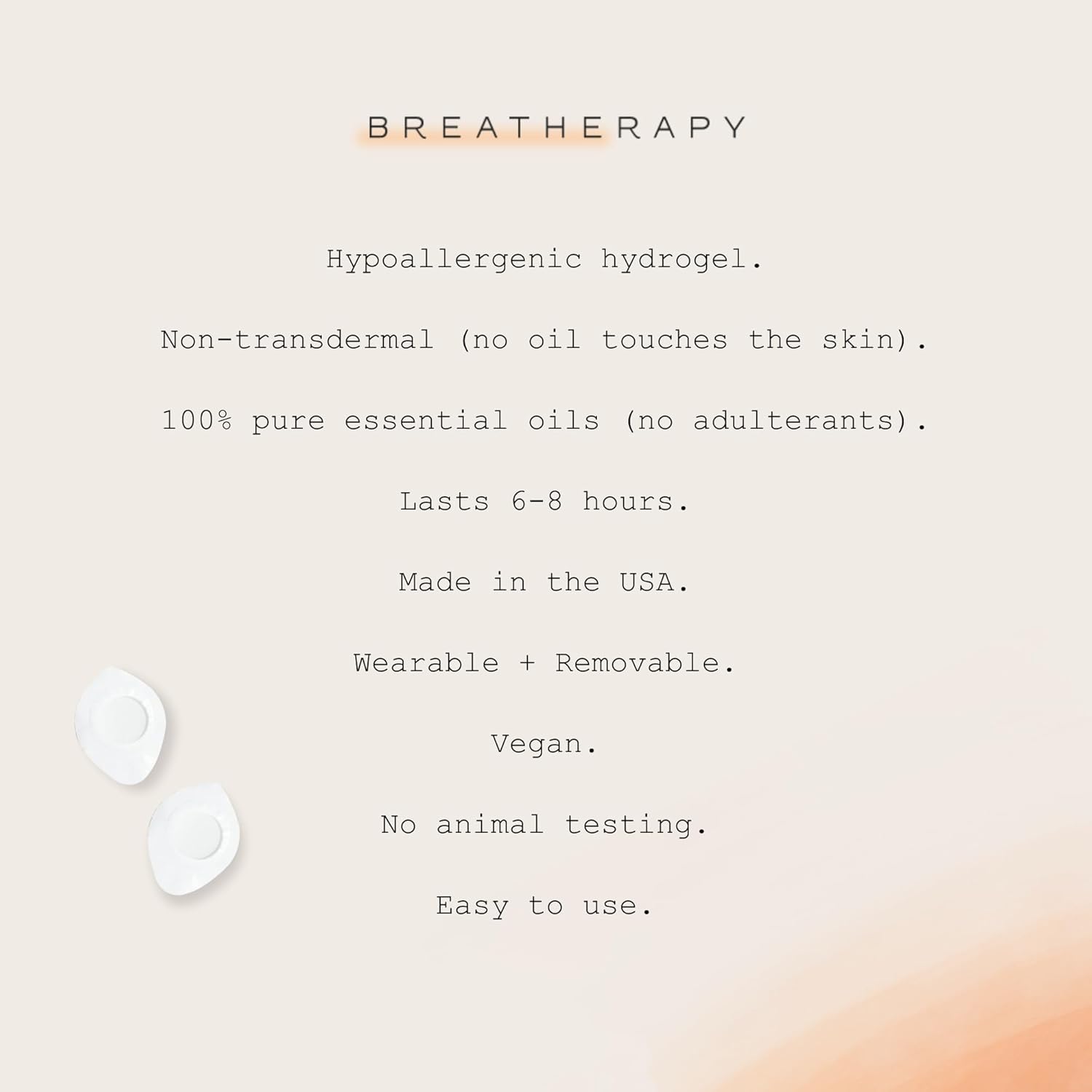 Portable and discreet: Breatherapy patches work like a personal diffuser and can be worn on skin or clothing. Simply attach to your upper chest, wrist, neck or anywhere near enough to your nose to smell it. Wear 30 minutes up to 8 hours.