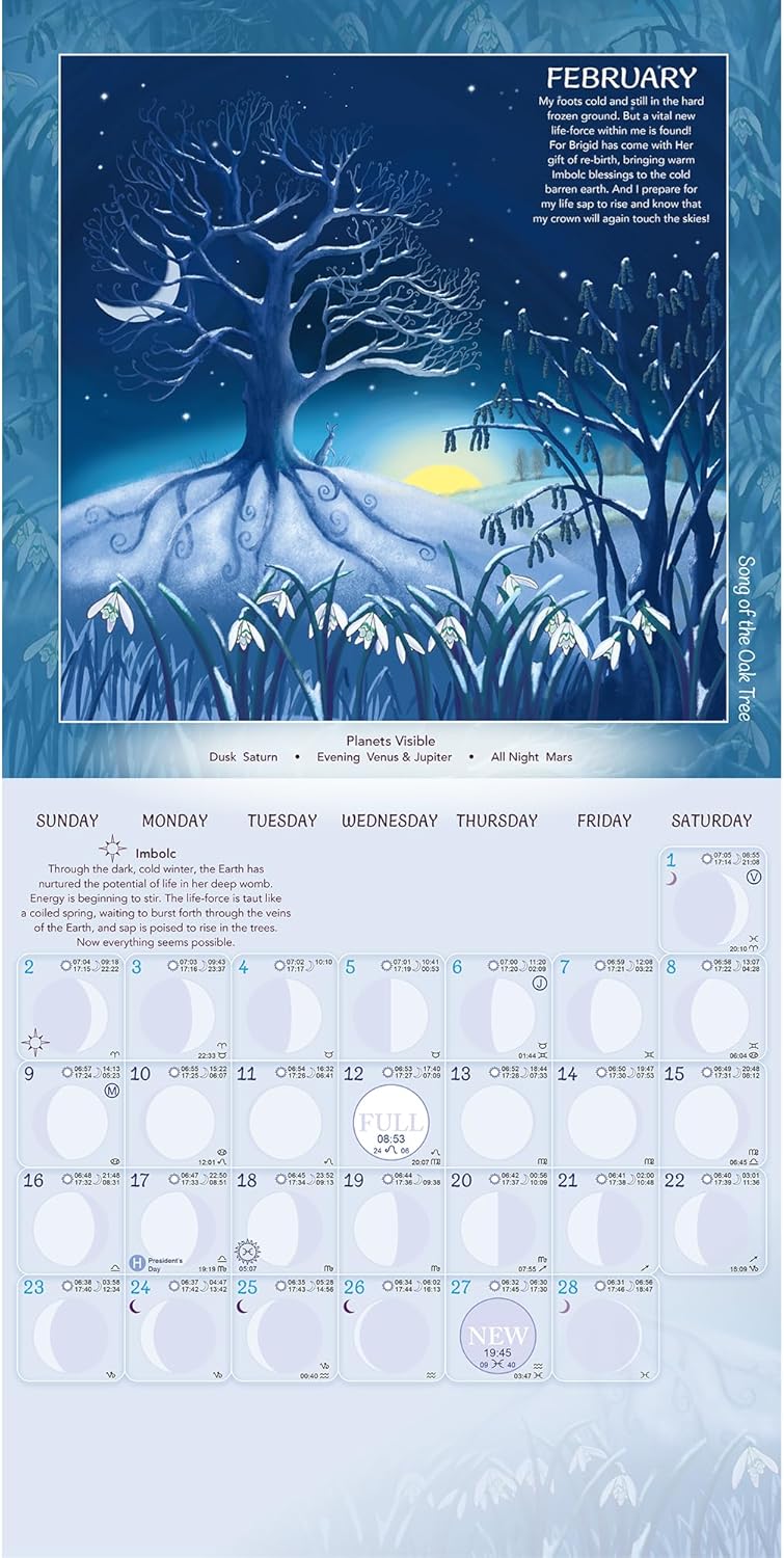 I buy this calendar every year. It is colorful & so informative. It shows stages of moon & which planets will be in view. It tells you Sun & Moon rise time. It shows Solar & Cross Quarter Festivals, Solstices, equinoxes, & Astrology signs. It displays whimsical art. I buy for me & several more to give as gifts. Love this calendar.
