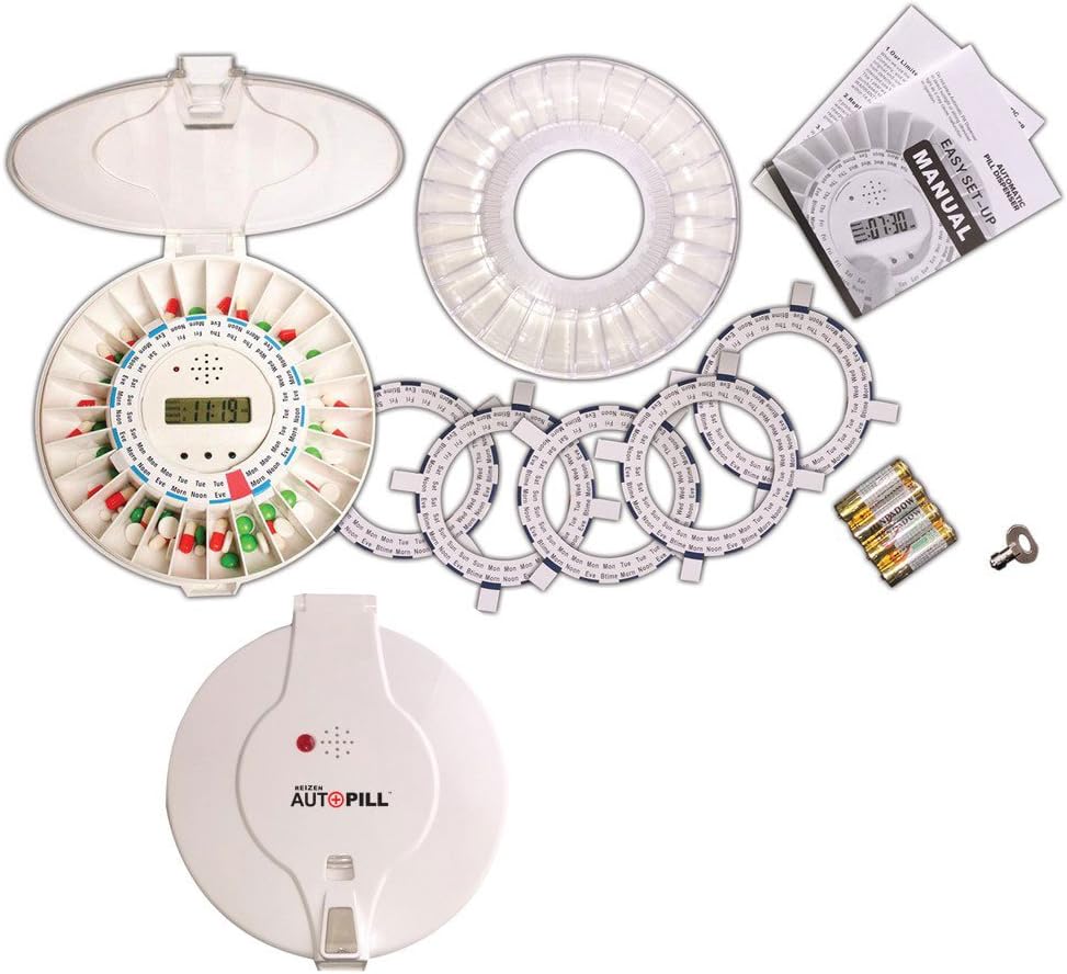 The Automatic Pill Dispenser helps to ensure that medications are taken properly and on time. Schedule up to 6 daily doses with the built-in programmable timer. This easy to use medication management system will dispense the right dosage of the right pills at the right time. It was designed especially for the elderly, Alzheimer’s patients, those with low vision and patients with complicated daily medical regimes. The Automatic Pill Dispenser can be loaded with medications for one to two weeks, depending on the number of doses per day. Only the designated dose is available. A loud beeping signal (3 tone settings) sounds when it is time to take the medication. If the medication is not taken (skipping of doses), it is kept safe in the locked Automatic Pill Dispenser, which is also completely portable. Features: – Medication reminder and automated pill dispenser in one – Ideal for both in-home care and for large caregiver facilities – 28 medication compartments – Up to 6 customizable alarms – NEW! – Tamper-proof locking key system helps prevent over-medication – Easy to program, only three buttons – Interchangeable Solid and Clear covers – NEW! – 3 loud alarm tones and a flashing red LED alert you when it is time – Helps ensure medication compliance – Reduces the need for personnel to distribute medication – Great for organizing and administering nutritional supplements – Low battery alert ensures you don’t skip your meds – Removable scheduling rings coordinates for multiple doses per day NOTE Before using test your dispenser, **to unlock tab, turn key all the way to the right. To lock, turn left** 1. Press and hold button 2 (9) for 5 seconds. “CH” will be displayed. Device is now in testing mode. 2. Press button 1 (8), and device will automatically proceed through following tests. a. “CH 1” will be displayed, and all display characters will then light up. b. “CH 2” will be displayed, and tray will then rotate one compartment. c. “CH 3” will be displayed, and a…