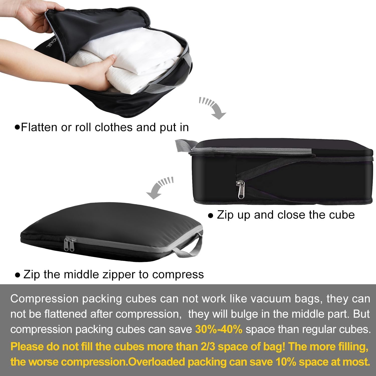How to Compress:The cube is compressed by the middle zipper; Using steps: 1)Fold and flatten clothes 2)Pack clothes in the cube and zip the front zipper 3) Put a finger on the back of the middle zipper when compressing to avoid zipper get stuck in fabric