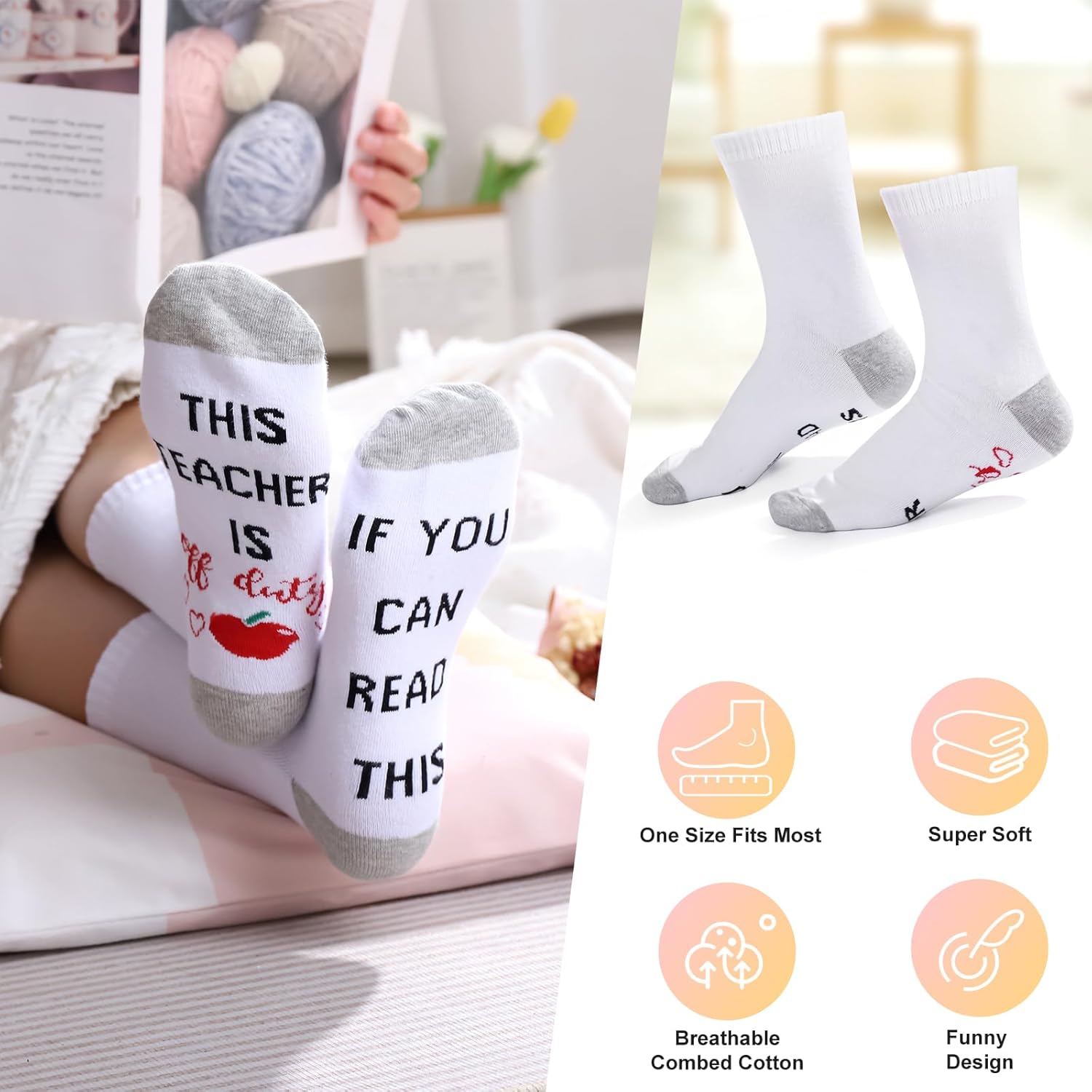 The breathable socks that comfortably and are super soft,keep your feet comfortable all day,suitable for most women,With humorous words on socks- “If You Can Read This,This Teacher Is Off Duty”these socks are perfect Christmas gifts to your favorite teacher and surprise her!