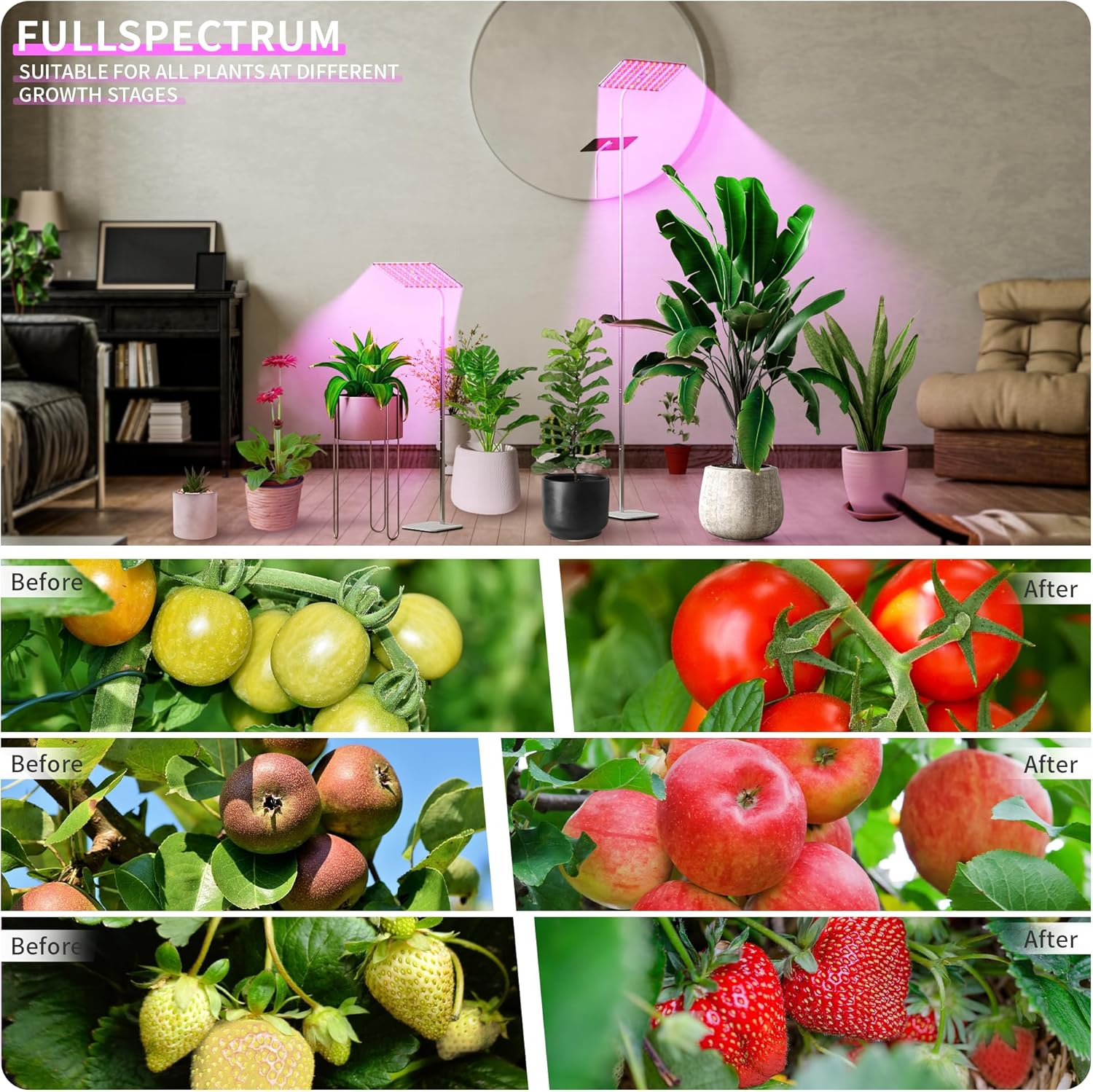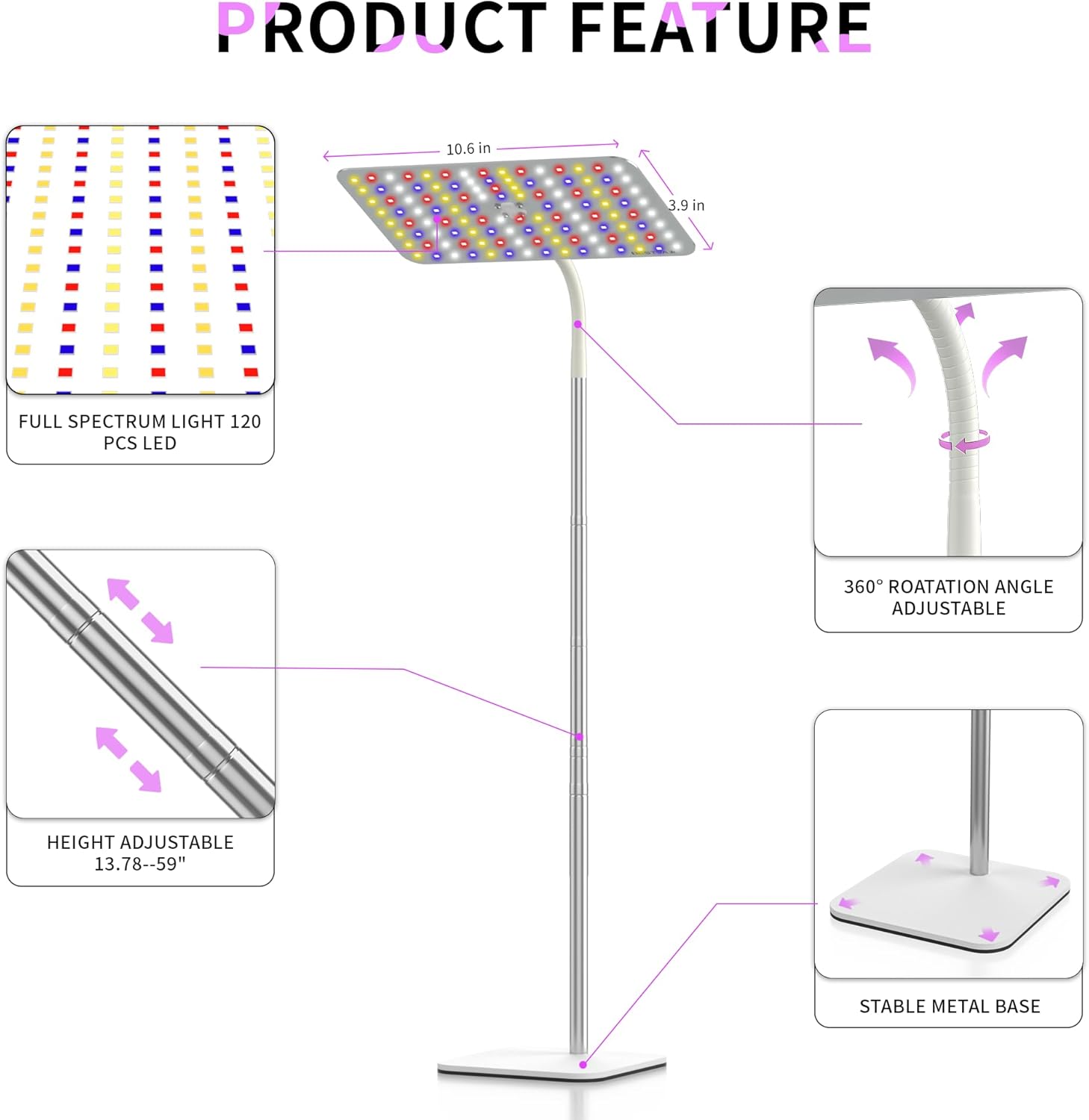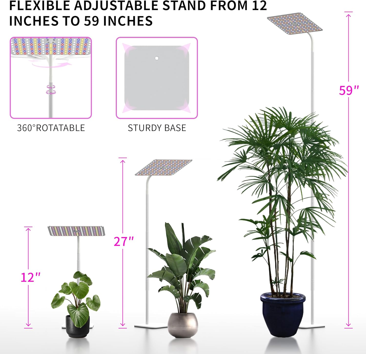 Floor Grow Light with Adjustable Stand:This grow light lamp with a stable metal base that allows you to place it on the floor or tabletop and adjust the head height from 12“ to 59” depending on your application. The flexible gooseneck can rotate 360 degrees, allowing you to easily adjust the height and angle you need to suit your plants!