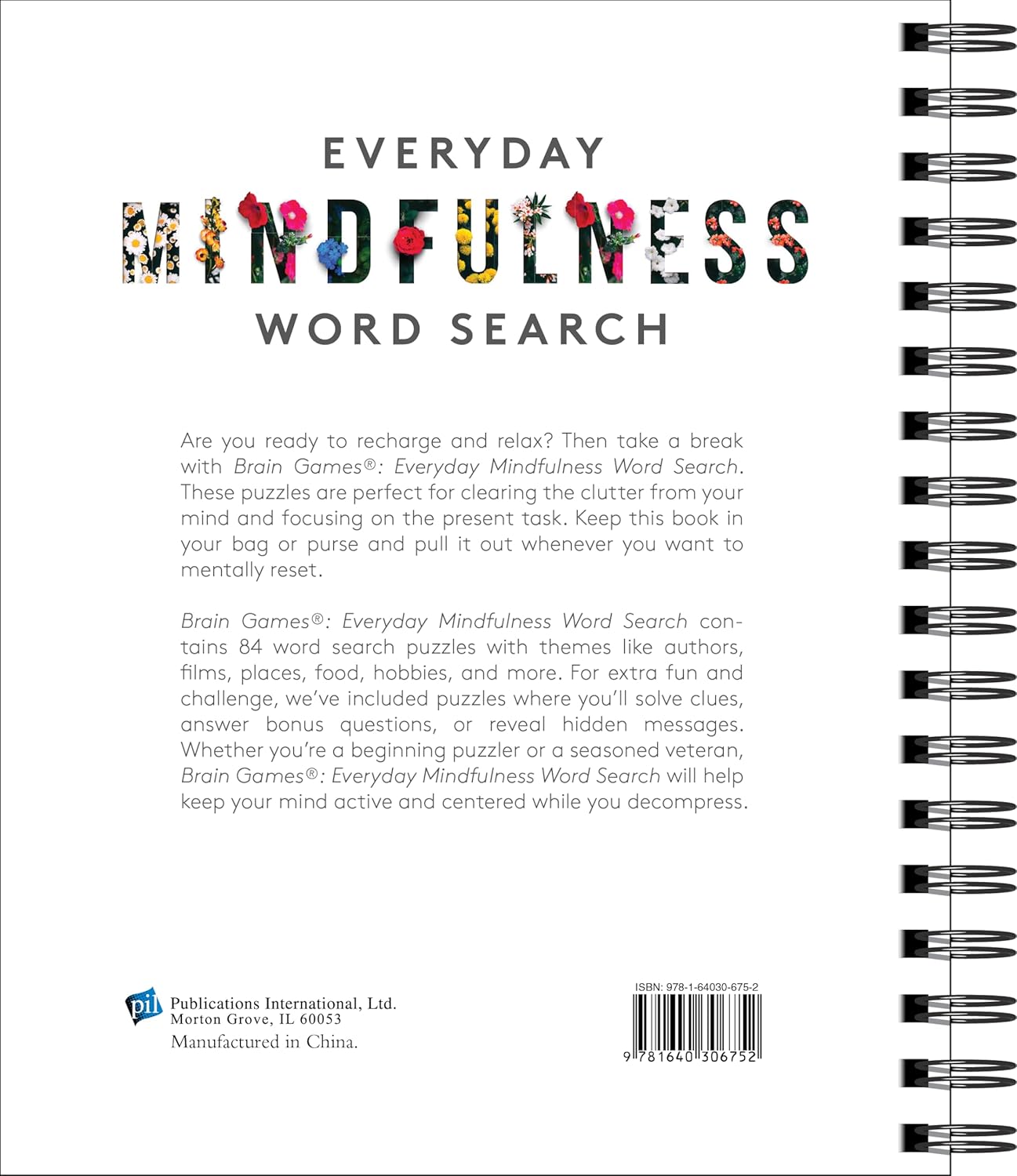 Everyday Mindfulness Word Search contains 84 word search puzzles to help you relax and unwind.The word search puzzles cover a variety of themes, and will keep your mind engaged without stressing you out.The book includes some unique word searches where you’ll have to answer clues or reveal a hidden message.Spiral binding and complete answer key make this book easy to carry, solve, and check your answers.192 pages*This is an alternate cover option of ISBN-13: 9781645582168 Brain Games – Mindfulness Word Search (Yellow).