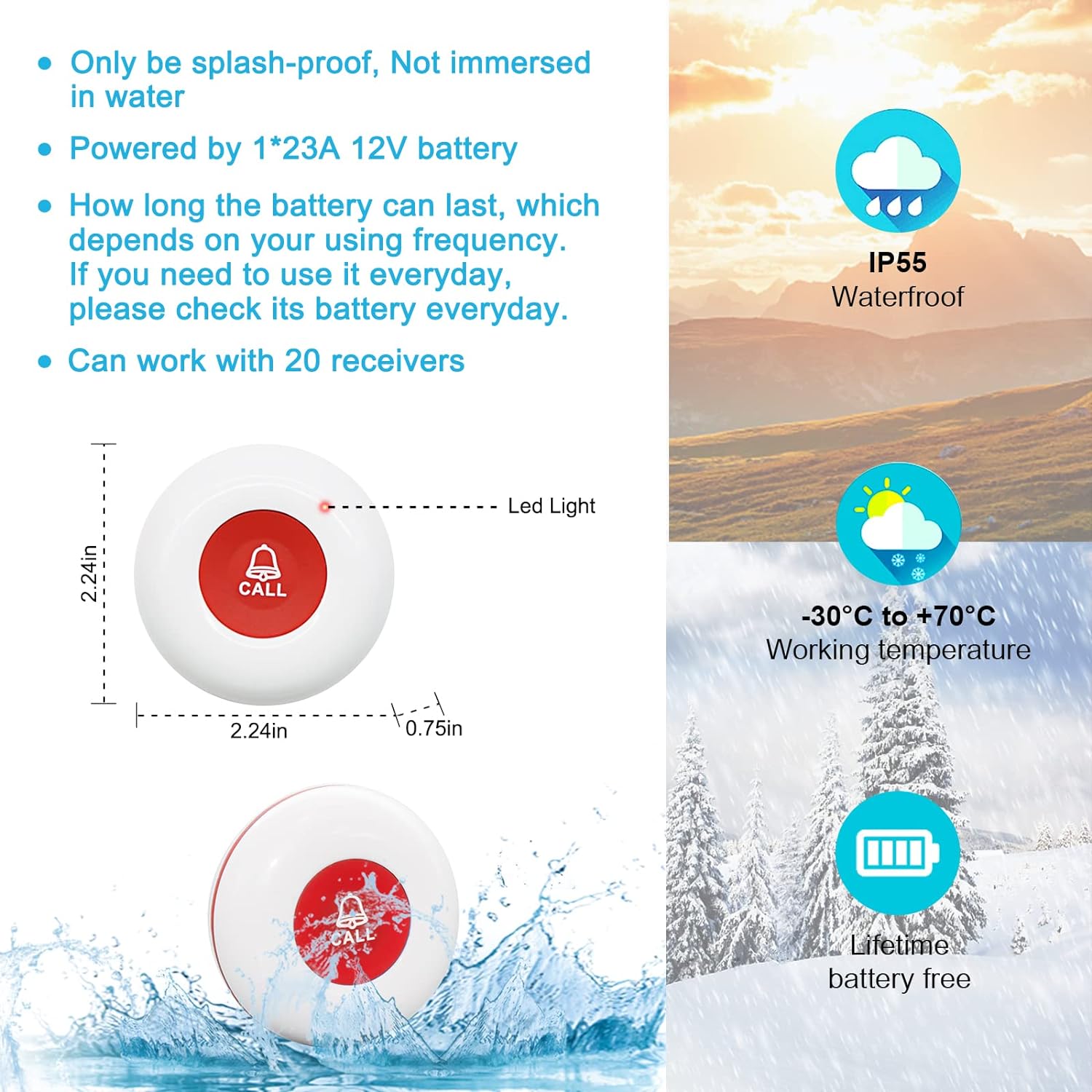[Waterproof & Easy Carry] Transmitter/Push Call Button is acceptable for Meal/Soup Splash. And Allow to be Installed in the Washing Room.It can Be Put in Pocket.Or Hang on neck as Pendant. Fixed in Bedside/Washing Room. The Fixed Bracket and Double sticker are included