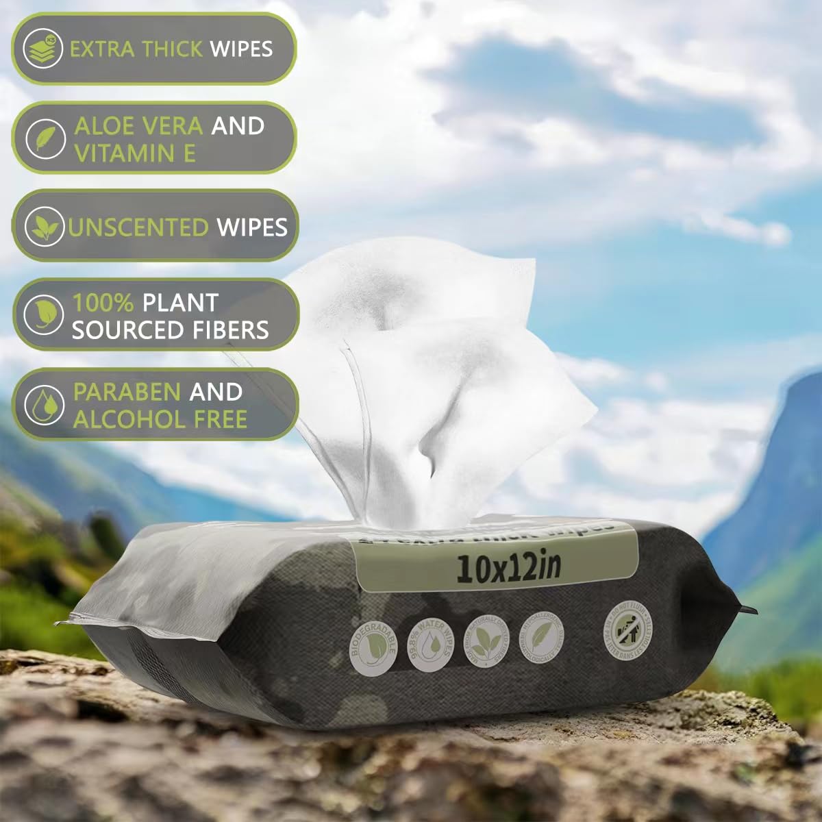 【MULTIPLE USES】 As Outdoor Wipes, they are ideal for maintaining hygiene on the go, whether as bathroom wipes or camping butt wipes. These hiking cleaning wipes are also large enough, ensuring thorough cleaning for larger surface areas. are also perfect for use with biodegradable poop bags camping, making your wilderness journey more comfortable and hygienic. They double as bath wipes or man wipes