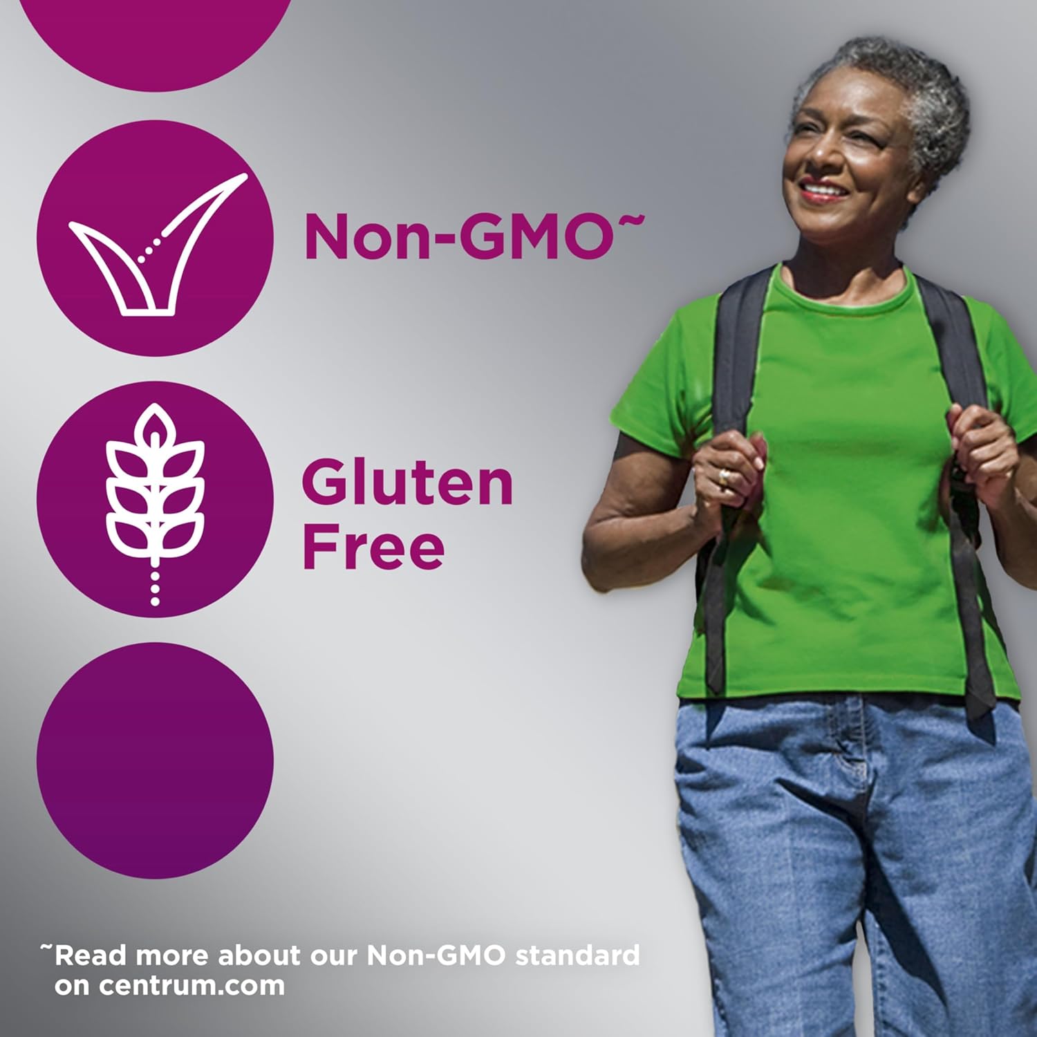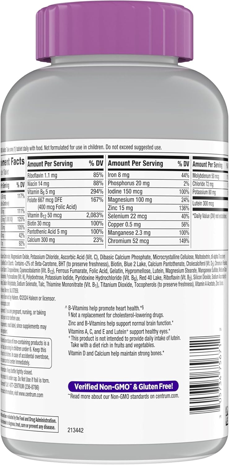 Centrum Silver Women’s Multivitamin for Women 50 Plus brings you a tailored multivitamin/multimineral supplement that contains micronutrients to help support full body wellness (1). This women’s vitamin with iron contains essential nutrients, including vitamin D and calcium to support strong bones and B Vitamins to help promote heart health (1, 2). This multivitamin for women over 50 also contains zinc and B Vitamins to help support normal brain function and Vitamins A, C, and E for eye health (1, 2). Key micronutrients in these multivitamins with zinc supplements help fill in nutritional gaps to promote overall wellness and vitality (1). These women’s vitamins are verified Non-GMO (3) and gluten free. This women’s multivitamin with iron features a smooth coating that makes it easy to swallow. Simply take one multivitamin daily to provide your body with essential vitamins and minerals. Centrum Silver is the number 1 Doctor recommended multivitamin brand now shown to support memory and cognition in older adults (1).* * IQVIA: Claim substantiation Validation Statement. July 2023. IQVIA, using the ProVoice Survey, recorded the product recommended most often within the Adult Multivitamins category by physicians and pharmacists in the United States. A statistically significant majority of the panel of physicians and pharmacists responded that Centrum is the product they endorse most.(1) These statements have not been evaluated by the Food and Drug Administration. This product is not intended to diagnose, treat, cure or prevent any disease.(2) Not a replacement for cholesterol-lowering drugs (1) (3) Read more about our Non-GMO standard on Centrum’s official website.