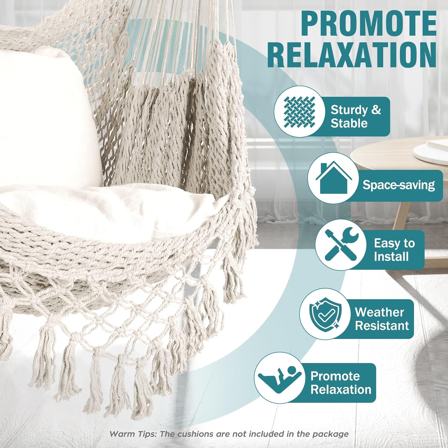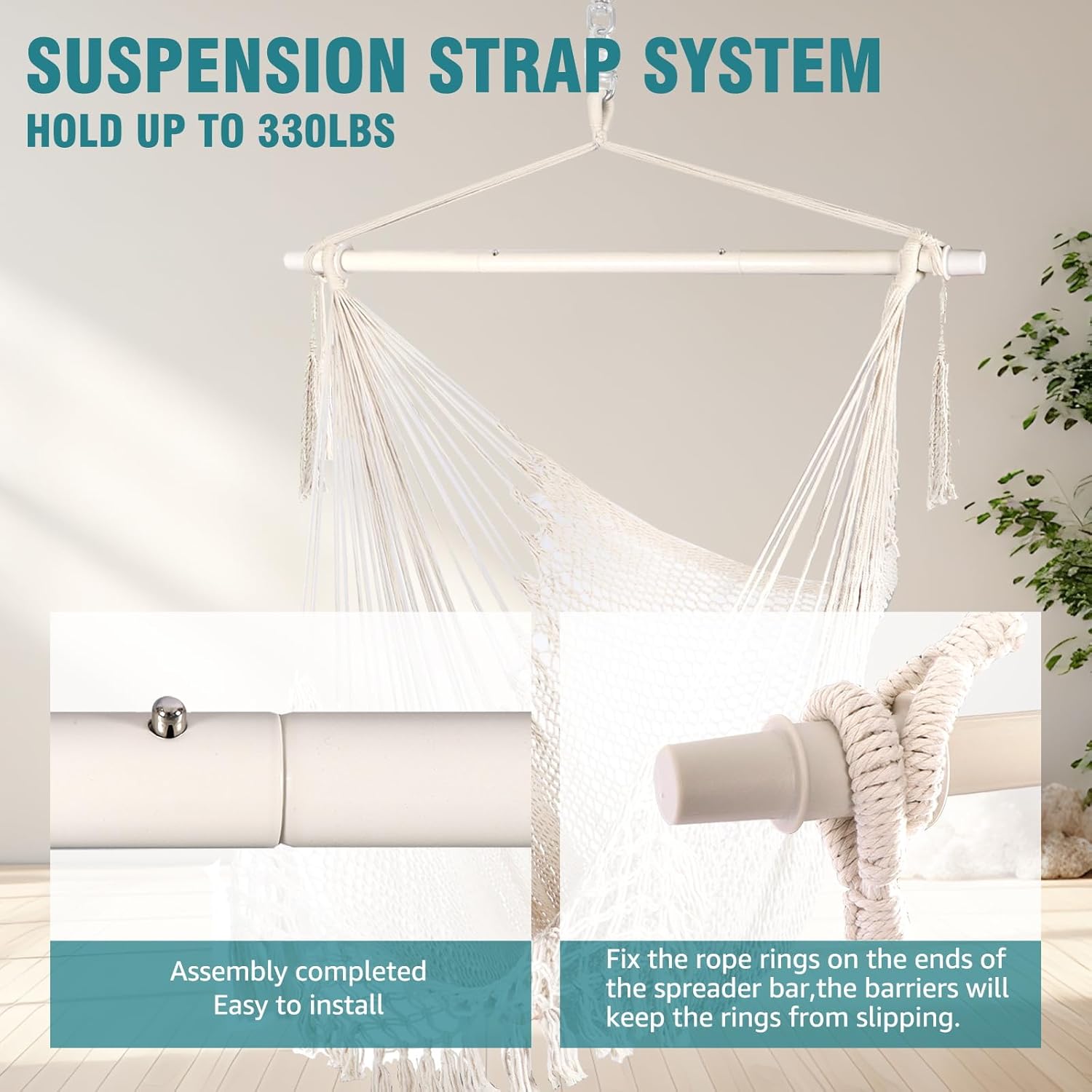 Comfort and Health benefits: They offer a gentle swaying motion that can be very soothing.Hammock chairs are incredibly comfortable and provide a unique sitting experience that can offer several health benefits, including improved circulation, reduced muscle tension, and better sleep quality.Strong metal spreader bar promotes your long lasting enjoyment.