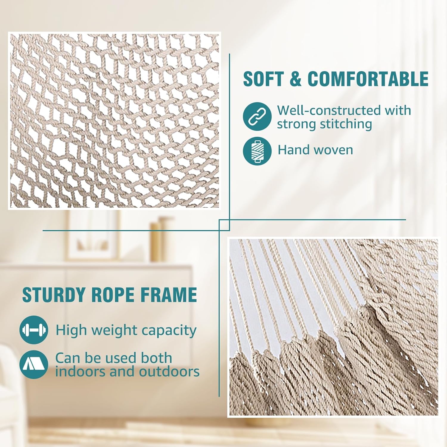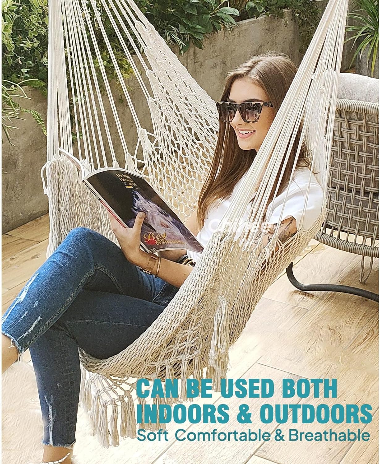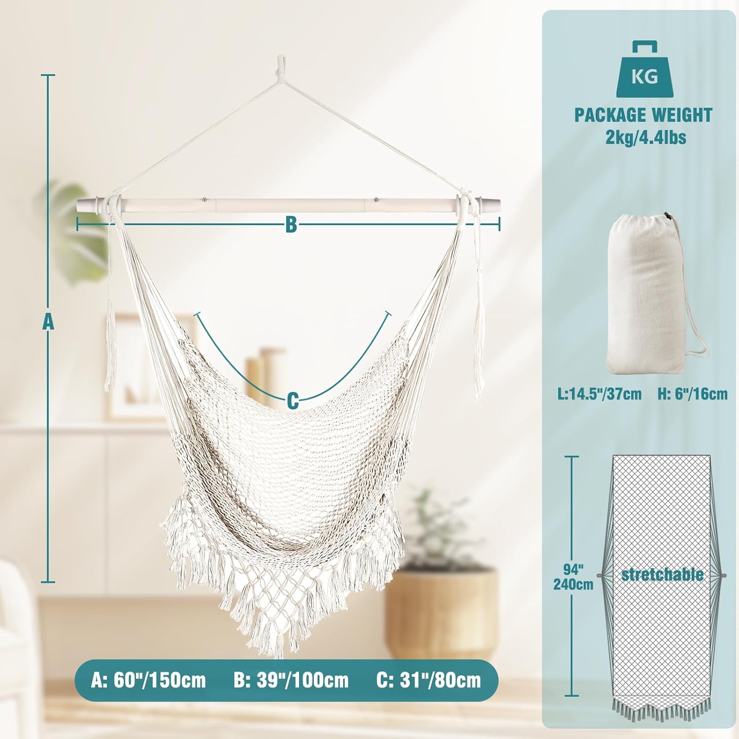 Design:Handcrafted from comfy and durable cotton ropes of the entire chair promise enjoyment and that is well-constructed with strong stitching and a sturdy frame to ensure safety and comfort.100 cm(3 1/3 ft) length wide spreader bar provides ample shoulder room.Extra long built in footrest to really stretch out .The mesh lets the cool breeze blow your body, breathable and cool.Anti-slip poles provide a stable and secure seating experience, preventing from slipping or sliding off the chair.