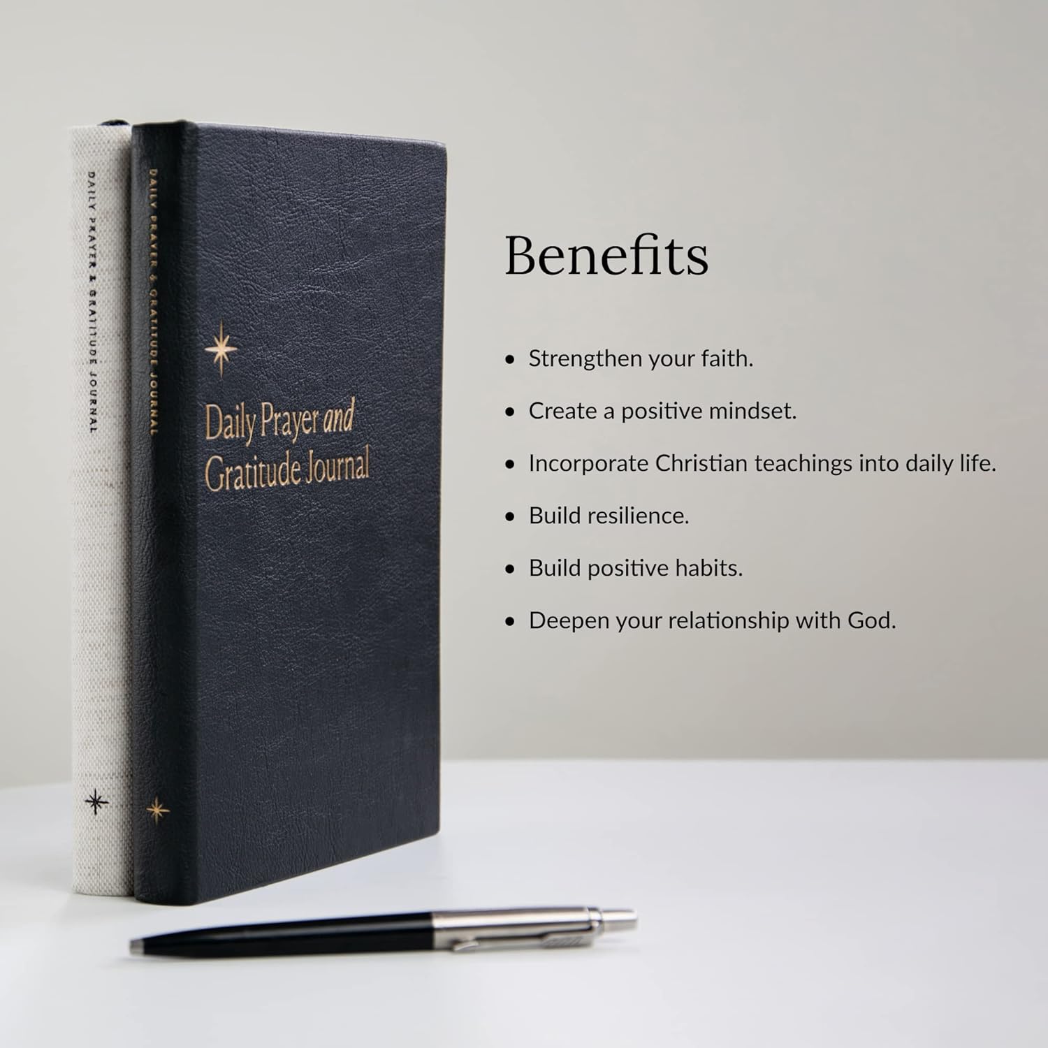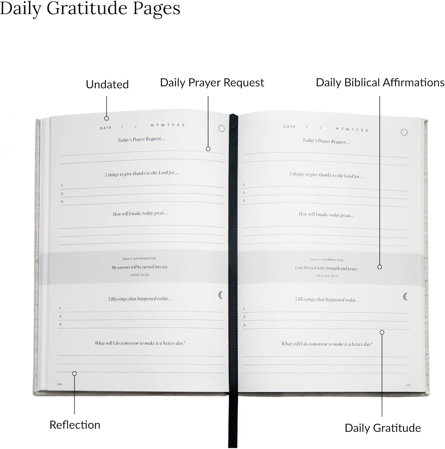 Connect with God through daily prayer and gratitude Reflect on the days blessings to plan for the following day Improve positivity through gratitude, biblical affirmations and reflection Allowing for big picture thinking and reflection Strengthen your faith through biblical affirmations and daily communication with God