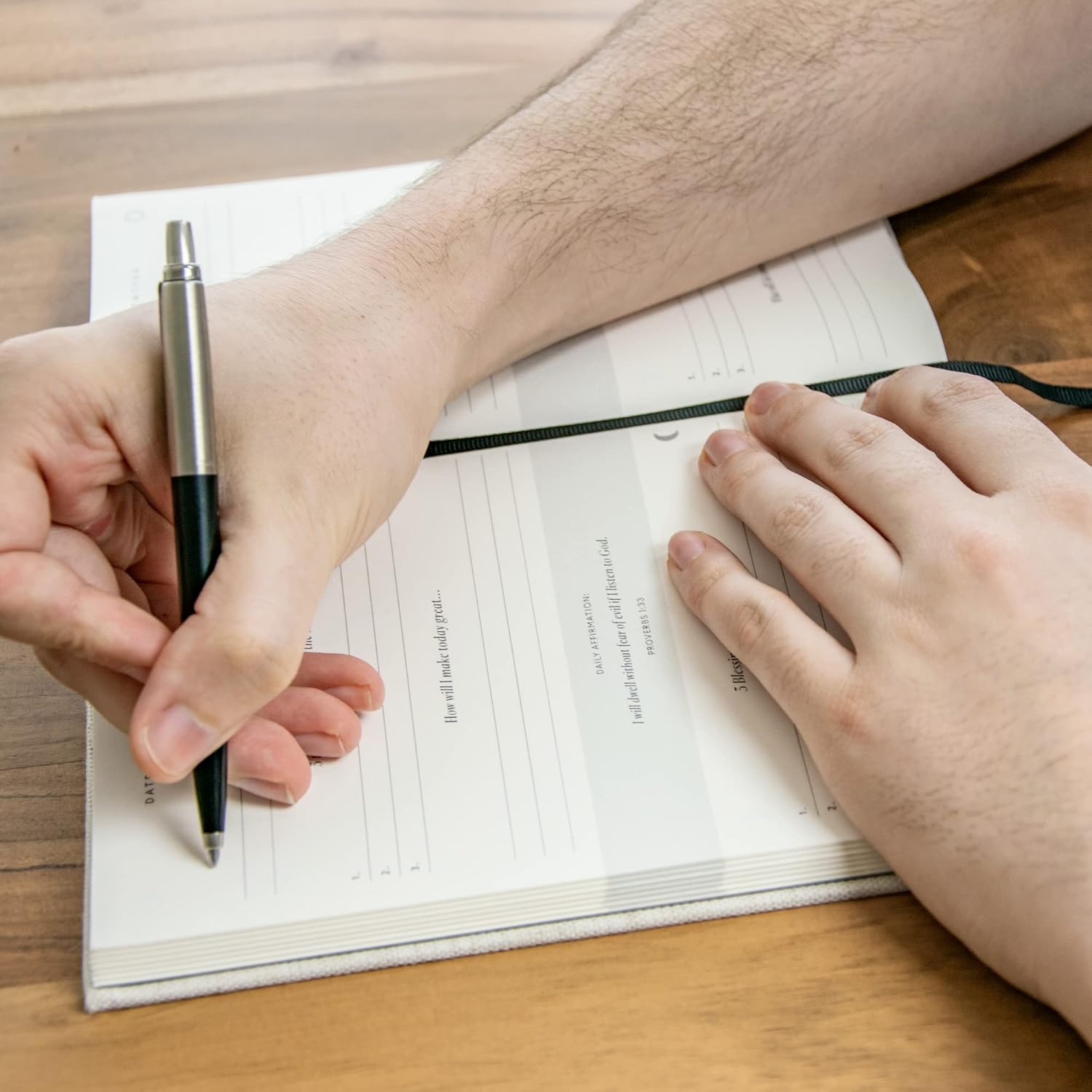 Man writing in prayer and gratitude journalMan writing in prayer and gratitude journal