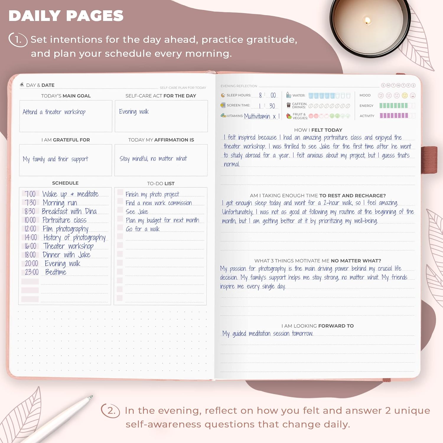I have never been interested in keeping a journal. After a family crisis i started seeing a therapist and she suggested it. I tried using a blank notebook and struggled with what to write so I looked for an alternative and found this journal. I like planning out my dat in the .morning and reflecting in the evening. The guided prompts and questions make it easy to fill out and I find I am reflecting a lot on my past and using it to help guide my day to day. It’s not always easy to carve out the time, but that made me realize how little time I gave to myself for my self care. It’s a foreign concept to put myself first but I am happier and feel more balanced.