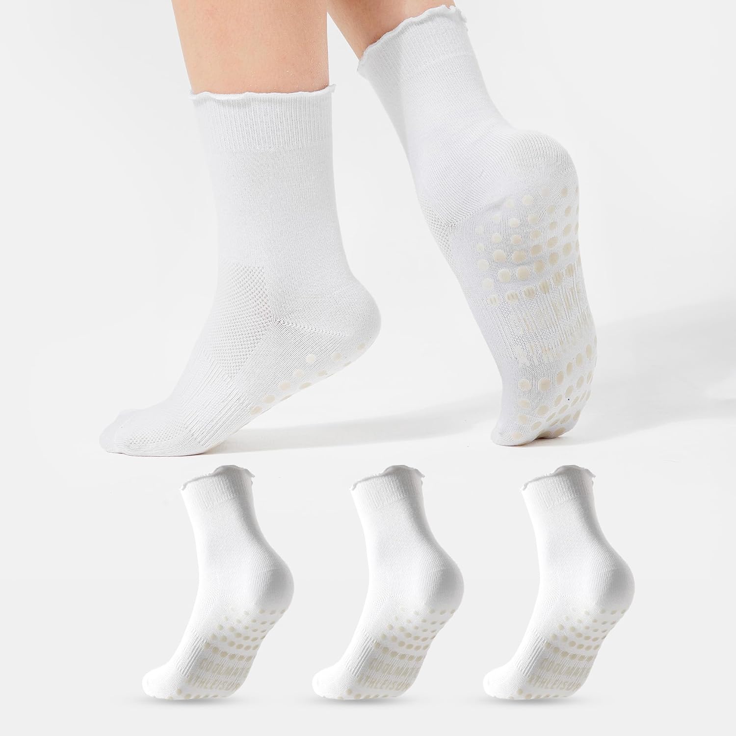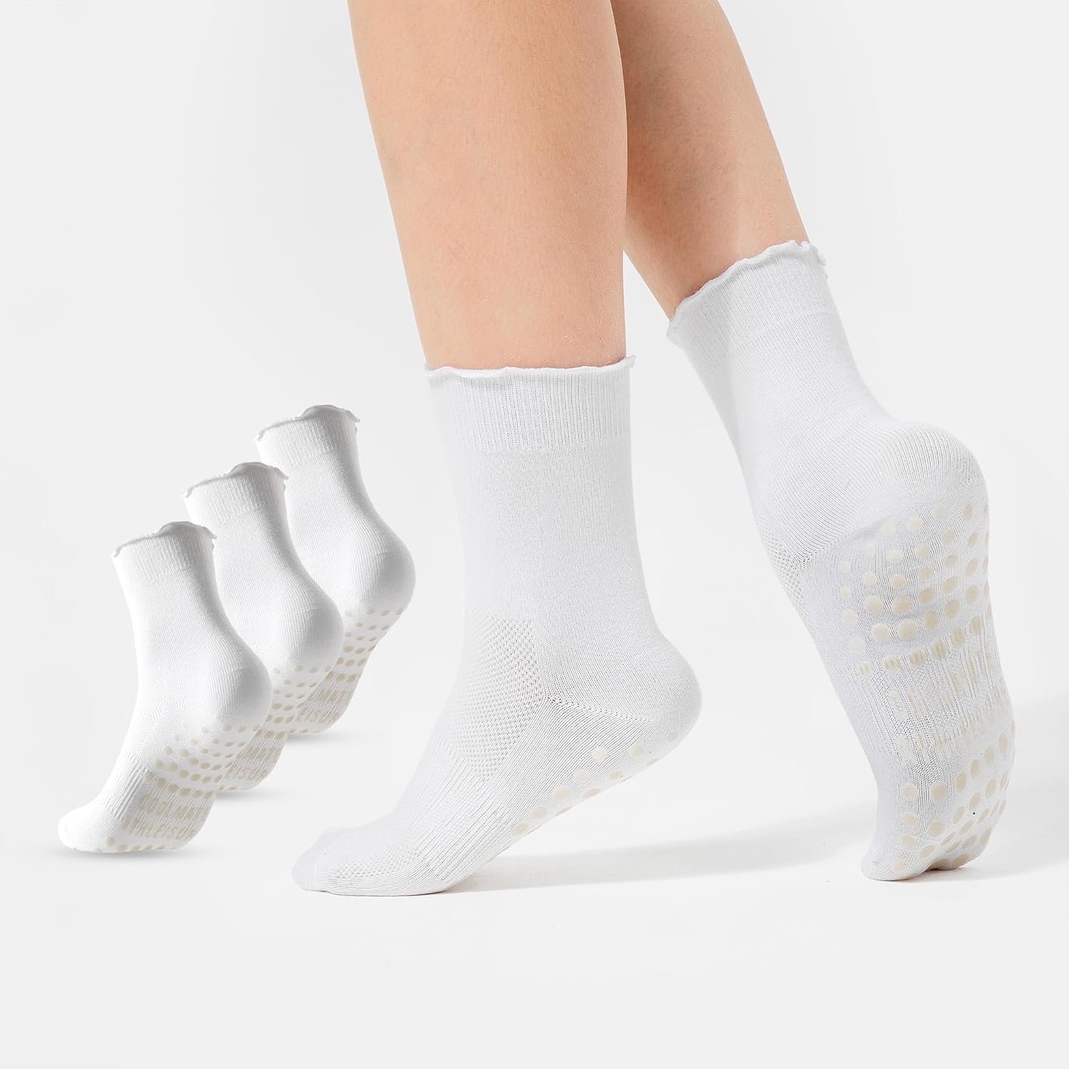 COOLMATE 3 Pairs Ruffle Pilates Socks with Grips for Women, Cute Non – Slip Crew Socks for Yoga, Barre, Lagree, Pregnant (US, Numeric, 6, 10, Regular, Regular, 3, Off-White)