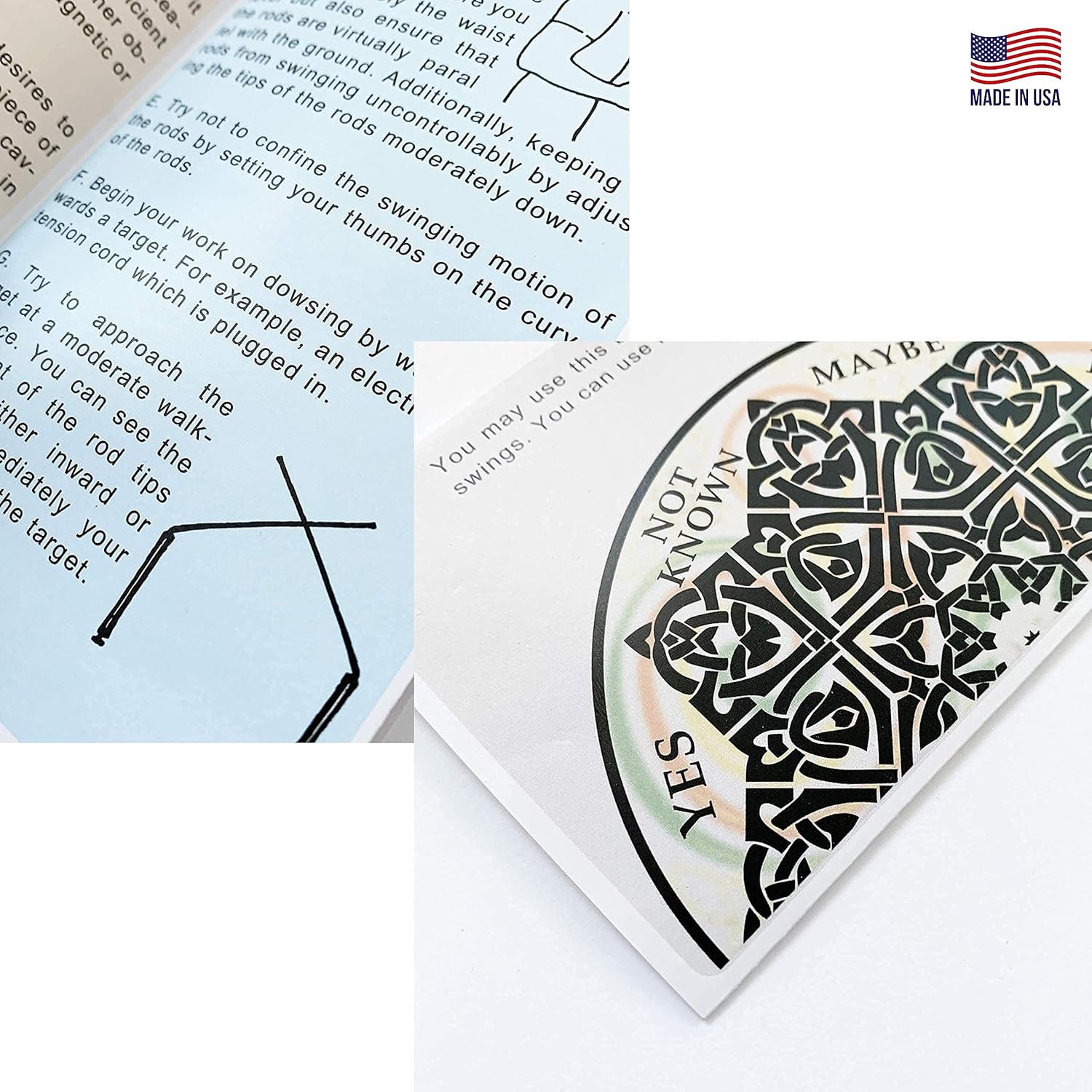 2 Pcs of Handmade Dowsing Rods, Only 1pc Pendulum selected randomly – Size =7/8″x5/8″, 1 Pc Pendulum Board and Instructions