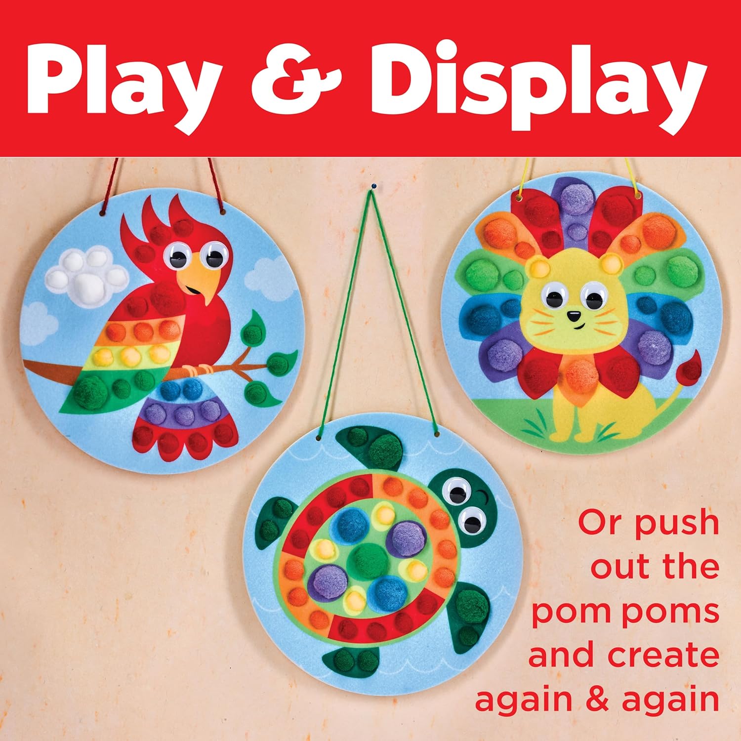 TODDLER ARTS AND CRAFTS: Use colorful pom poms to create fuzzy 3D animal pictures! Simply insert pom poms into the pre-punched felt to create designs you will want to create and display. Create and play again and again! Repeat play is easy and fun with this toddler craft for ages 3-4+, simply push out the pom poms and begin again!