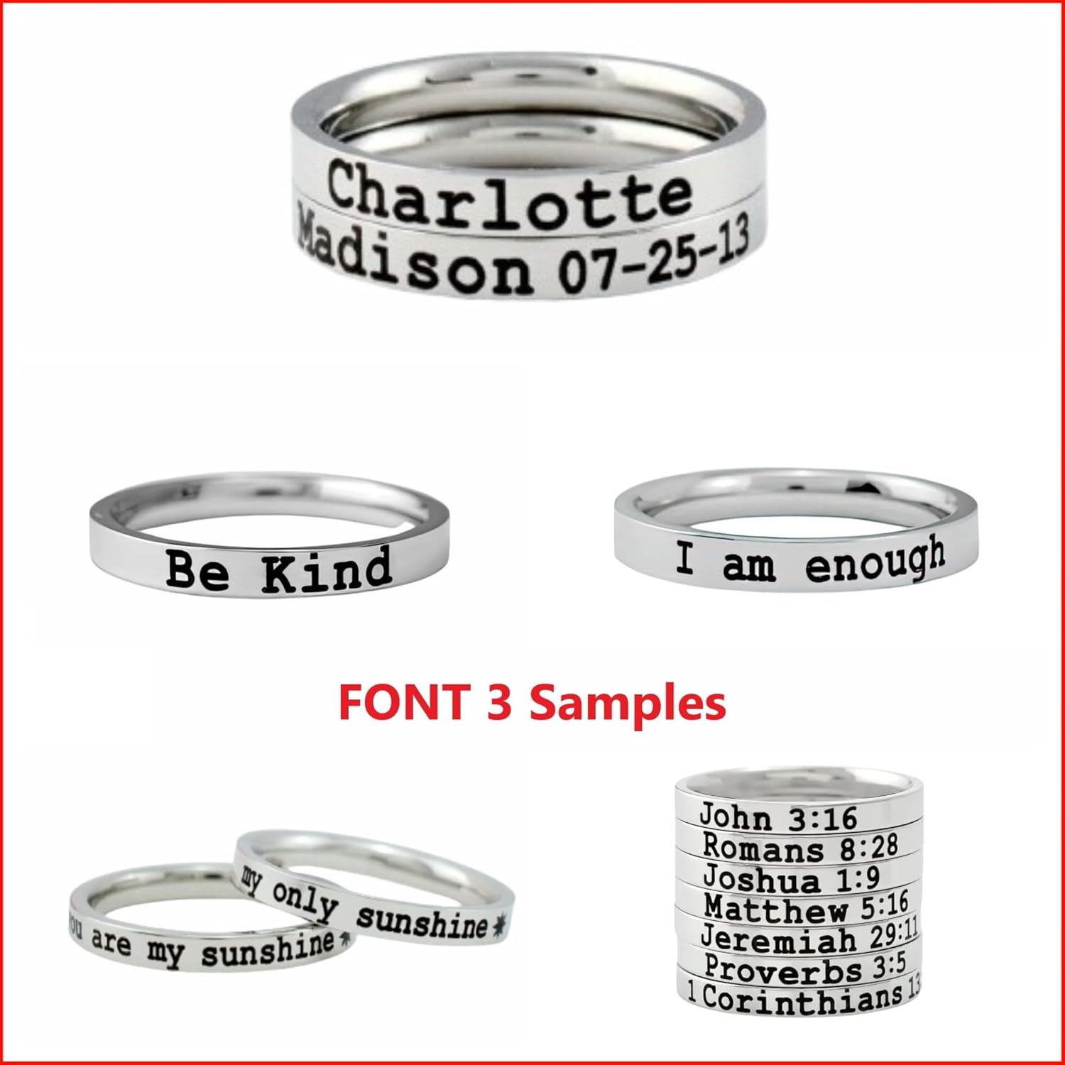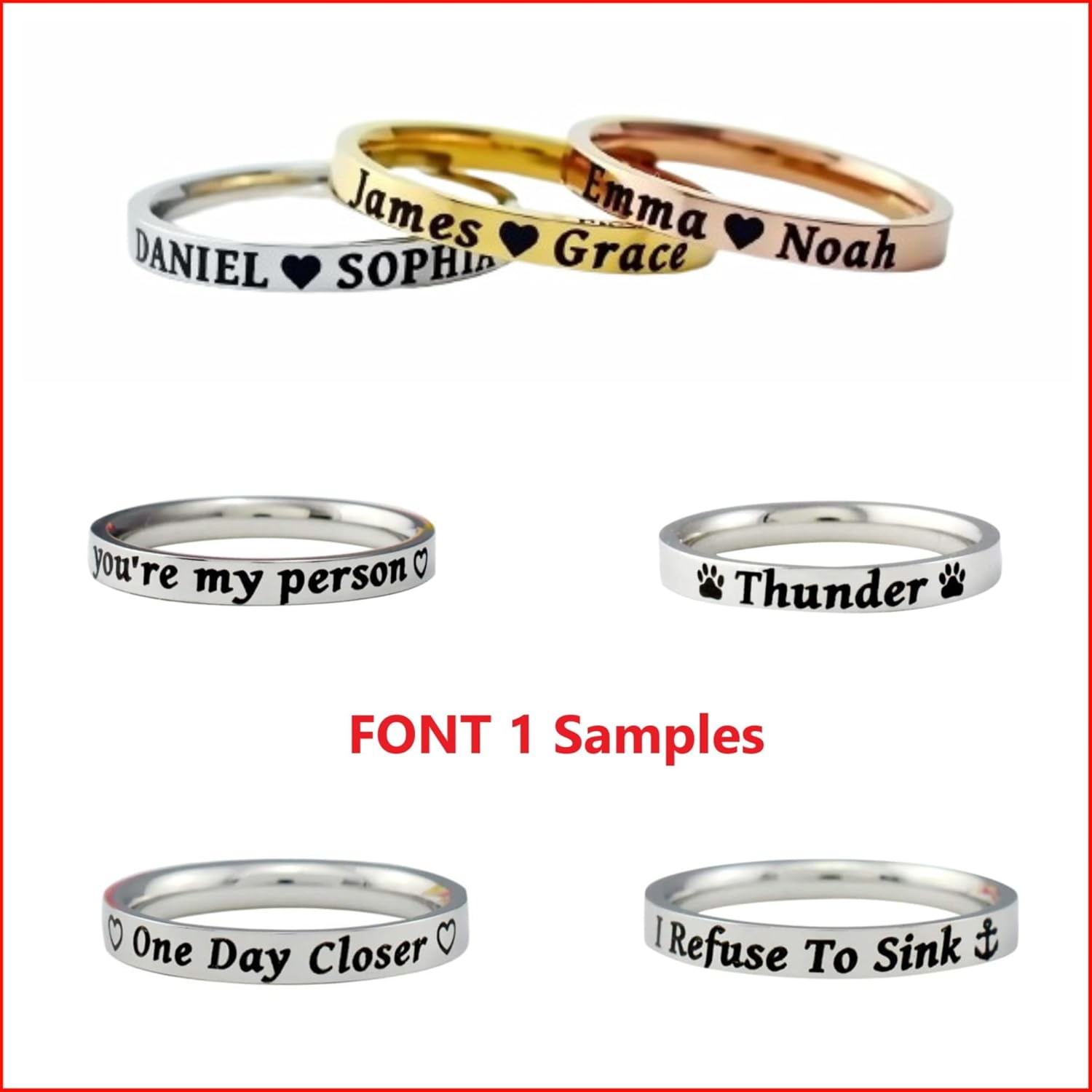 ● This listing is for one ring, the picture is only for showcasing the ring with different fonts and names; if you would like multiple rings, please select the desired quantity.