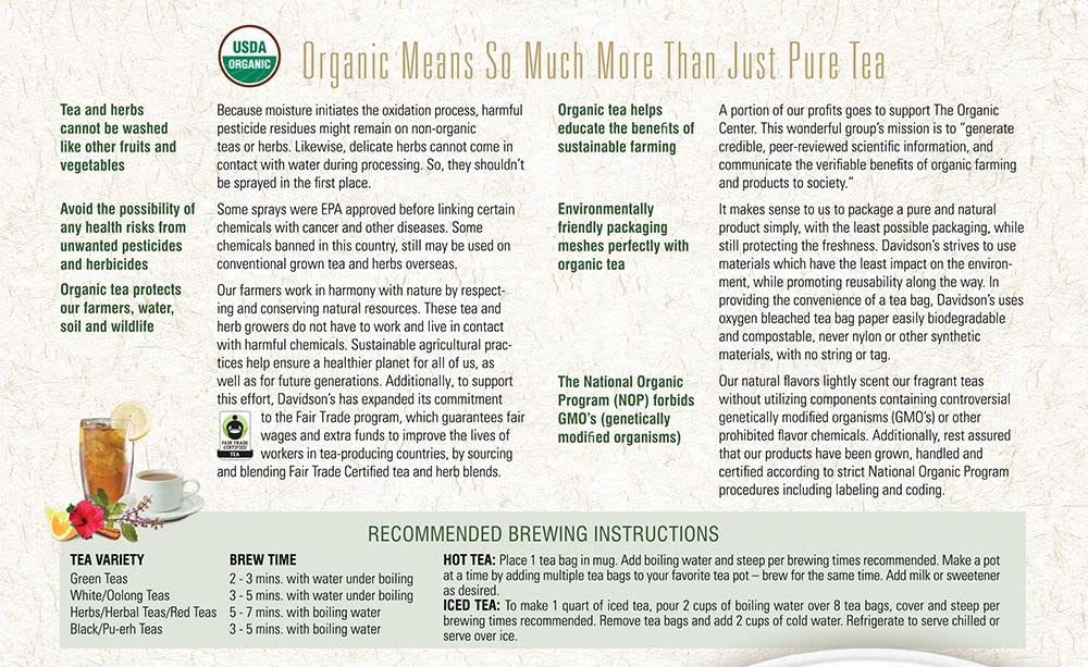 TRUST OUR TEA: Davidson’s Organics was the first purveyor of fine organic teas. Since 1976, we’ve worked tirelessly to develop blends that are true reflections of their names, while being committed to sourcing healthy ingredients grown by generations of skilled small farmers. Enjoy Davidson’s Organics, the organic tea that sets the standards for the highest quality.
