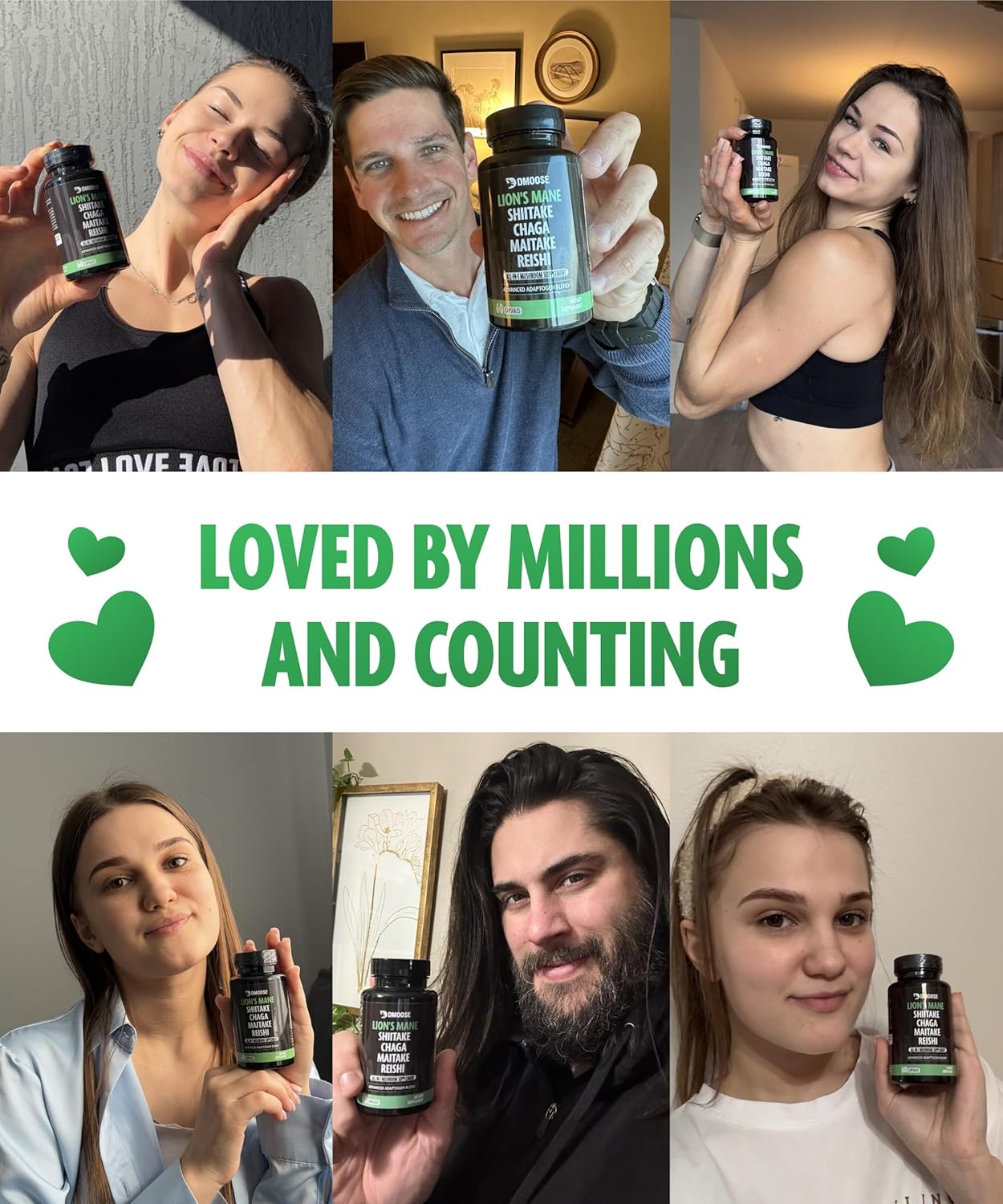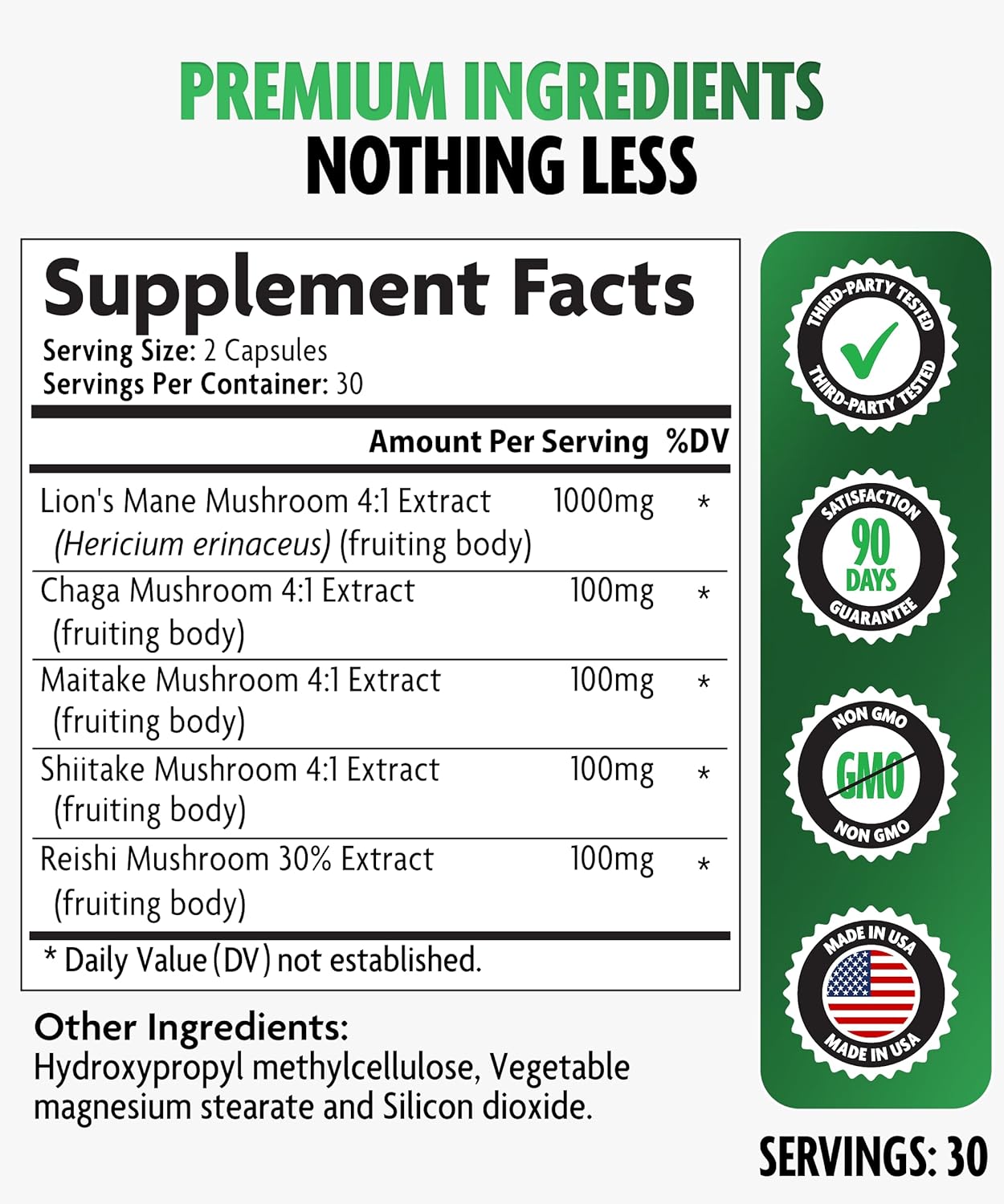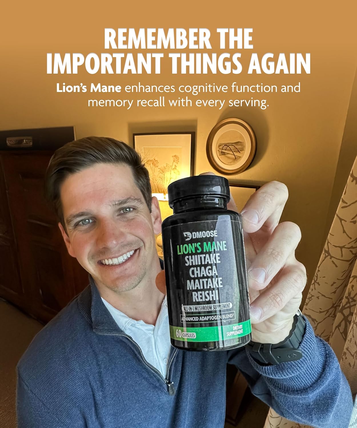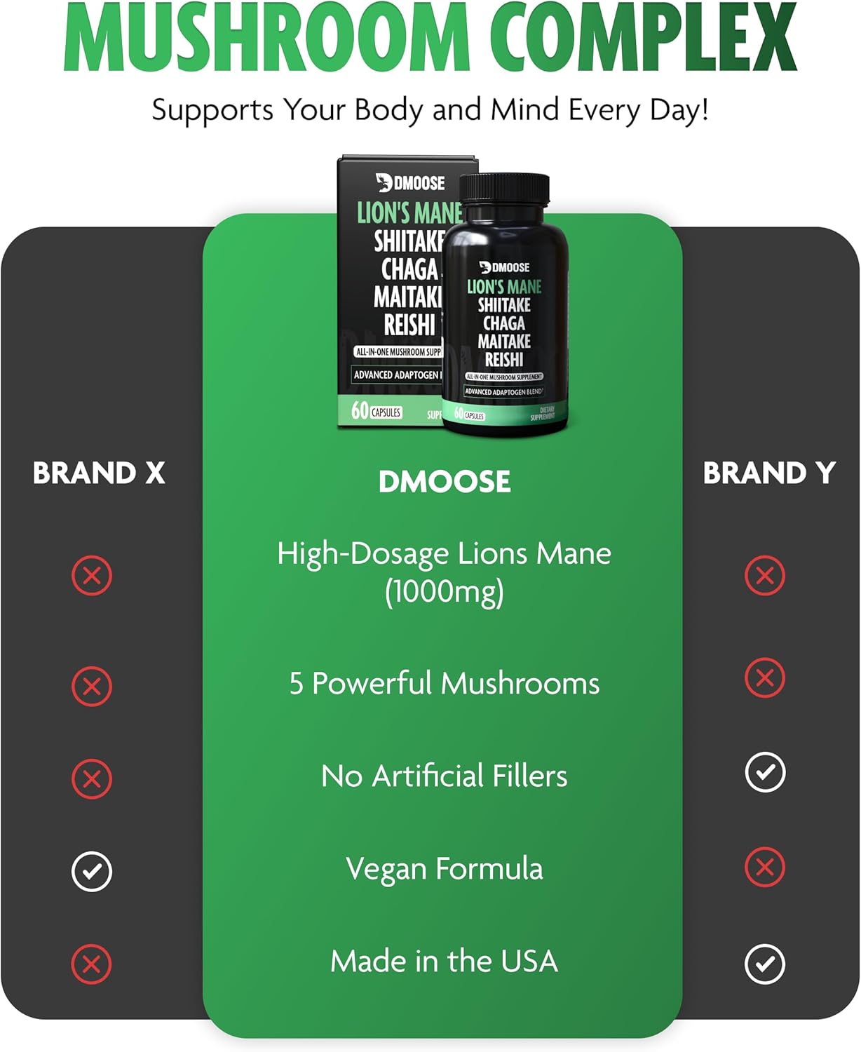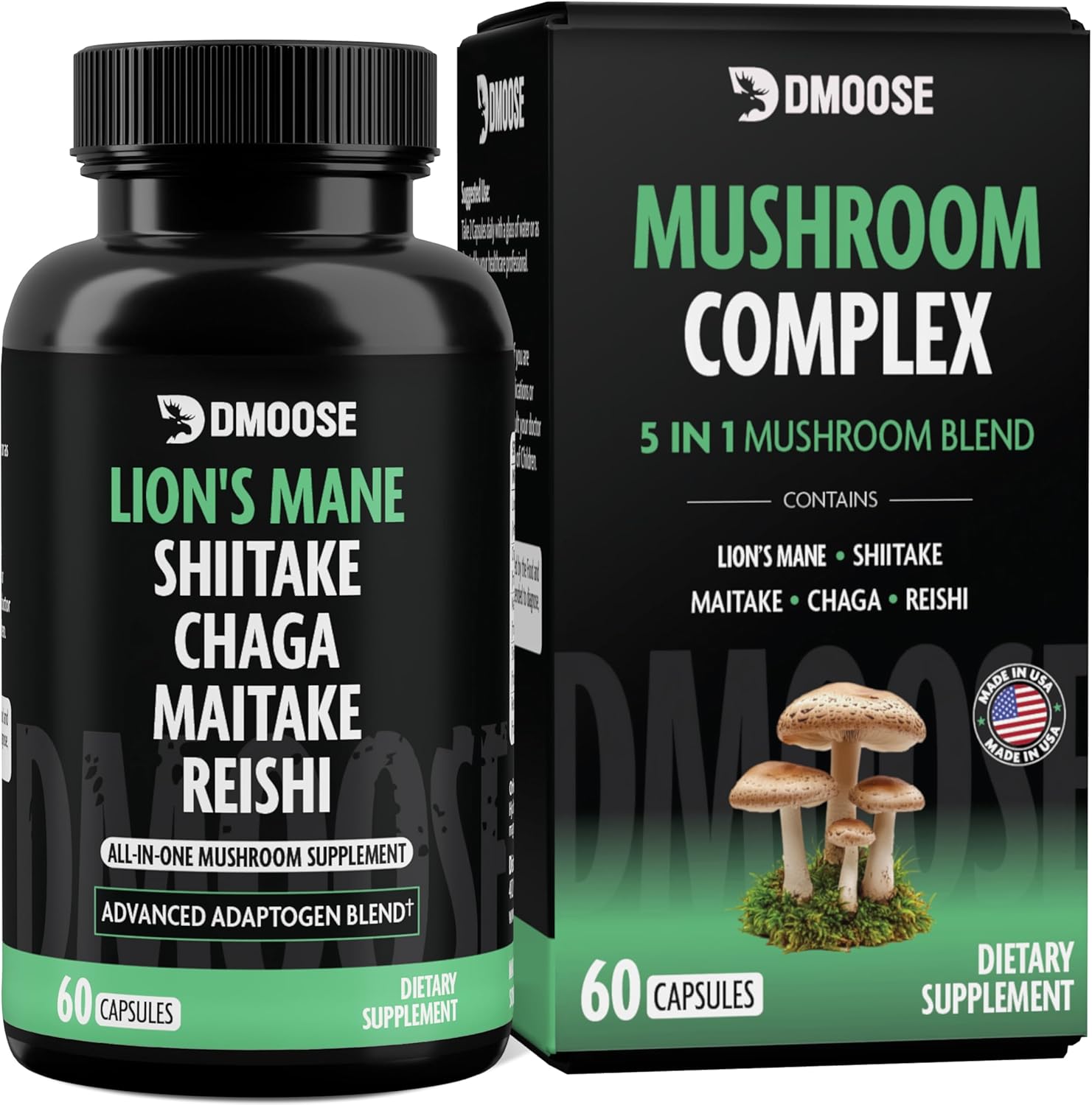 5 Mushrooms in 1 Powerful Capsule: Simplify your health routine with DMoose Mushroom Supplements, a potent 5 in 1 formula combining Lions Mane, Chaga, Maitake, Shiitake, and Reishi Mushrooms. Each capsule provides boosting benefits to support your brain health, memory, focus, energy, and immune support. Packed with premium mushroom extract, this Mushrooms Supplement is a solution for total wellness.