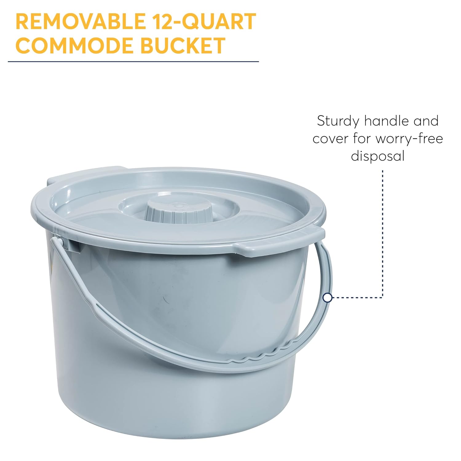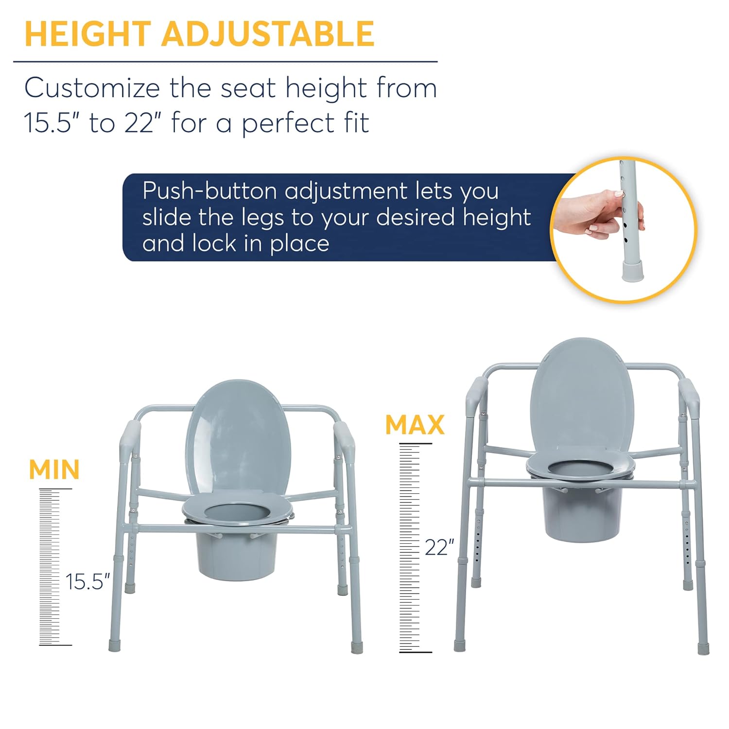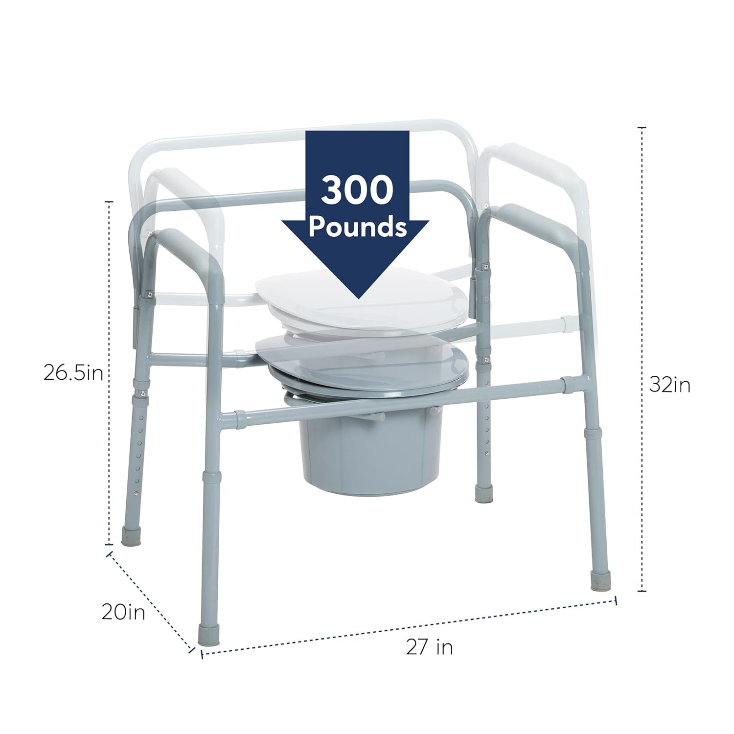 The Deluxe heavy duty bariatric folding bedside commode seat by Drive Medical is designed to meet your needs. The frame can be configured to be used as a bedside commode, toilet safety frame, elevated toilet Seat or over your existing toilet. The tool free removable back makes configuring the commode easy for any application. The armrests provide a comfortable place to rest on when sitting and indicate a safe place to grab making sitting and Standing easier. The push button Height adjustable legs makes sizing a breeze allowing this commode to be used as an elevated toilet Seat. In addition to comfort This commode can be folded with out tools making storage and travel convenient. The grey power coated steel welded construction ensures strength and durability able to hold up to 650 lbs. The product comes complete with a 16.5″ Deep snap on seat and lid, 12-quart commode bucket with cover and convenient carry handle, plus splash guard.
