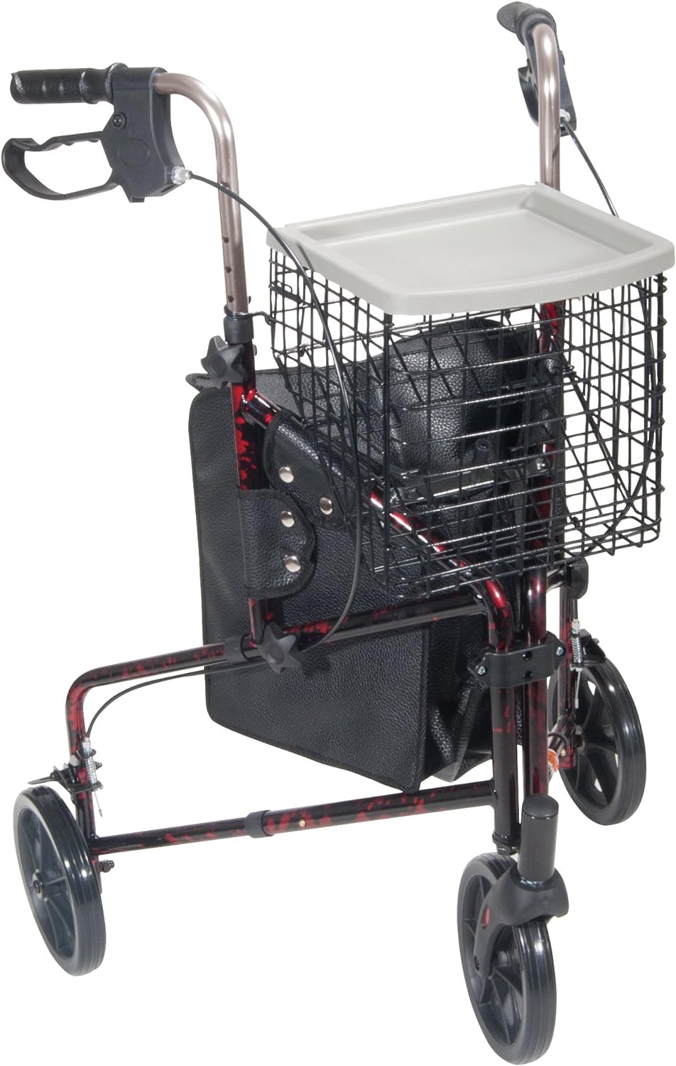 The Drive Medical Deluxe 3-wheel portable walker in red gives you stable mobility coupled with lightweight maneuverability and ample storage. The 3-wheel rollator is more nimble than traditional rollators to easily navigate tight spaces like restaurants and aisles. The foldable walker easily collapses to a compact size and weighing just 11 pounds, it is easy to load into the trunk or back seat. Height-adjustable handles ensure a custom fit, while solid 7.5-inch wheels provide smooth support both indoors and outdoors. Loop locks under the handles operate like a bicycle handbrake to quickly stop the walker when needed; simply push these down to lock the wheels for a longer period of time. Ample storage includes a basket, tray, and removable pouch so you can carry items with ease. These Drive walkers for seniors are also backed by a limited lifetime warranty so you can purchase with confidence.