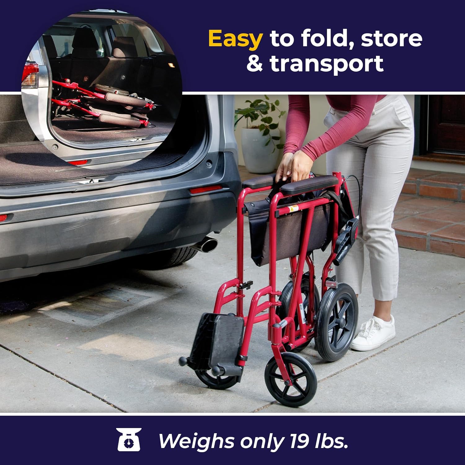 Portable and Easy to Store: A handy lever on the back of the foldable wheelchair makes it convenient to fold back down; at just 19 lbs, transport chair is easier to lift than a traditional wheelchair making it a great travel wheelchair for adults