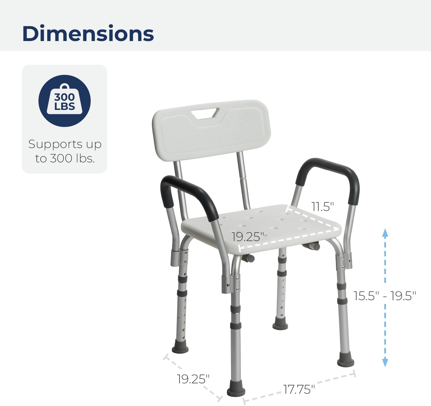 Adjusts to Fit Users: Slide the shower stool’s legs up and down in secure 1″ increments to adjust seat height from 16″ – 21″ to fit a wide range of users from petite to tall. Remove the arms or backrest to customize the bath chair for your bathing and transfer needs.