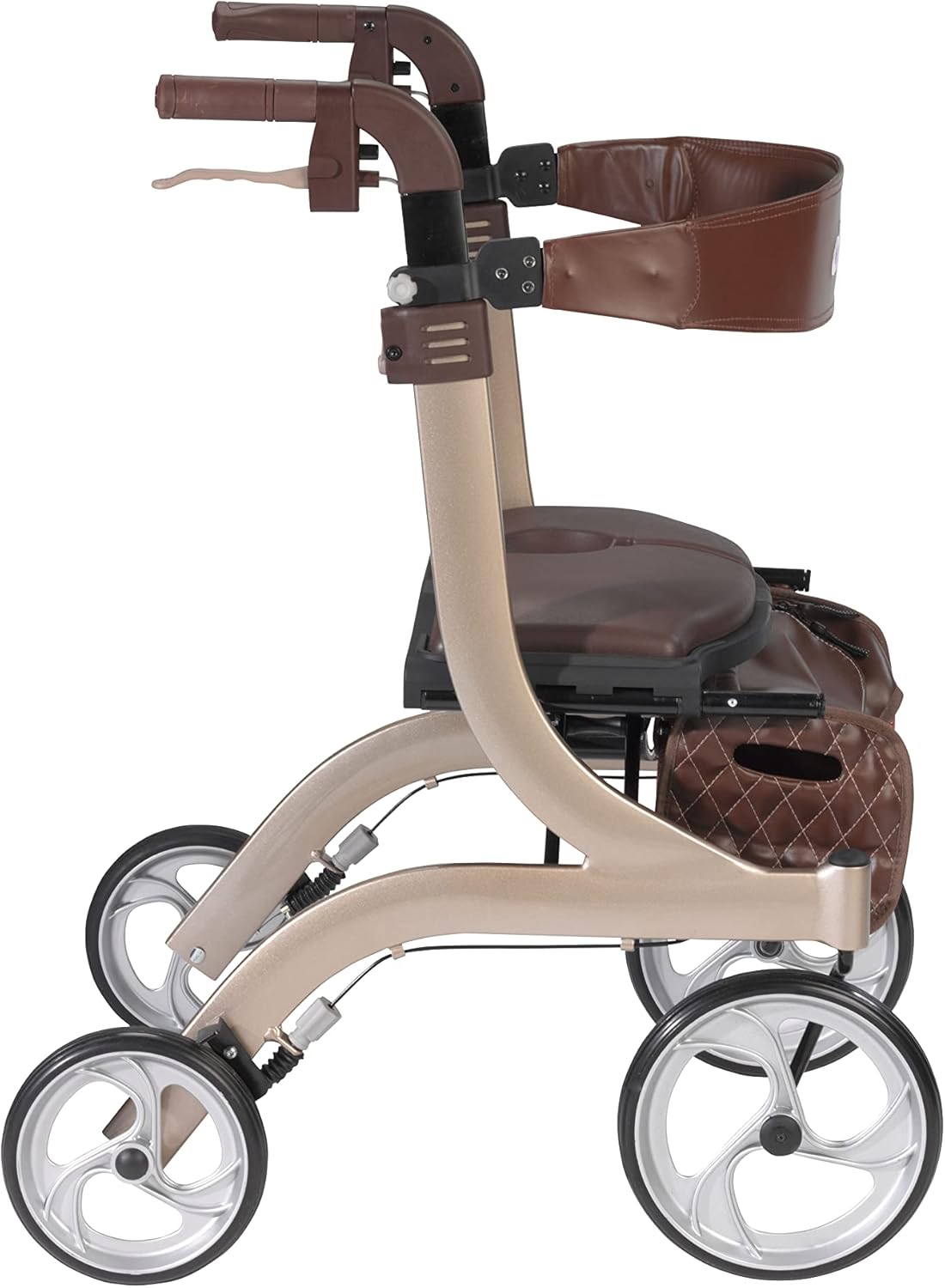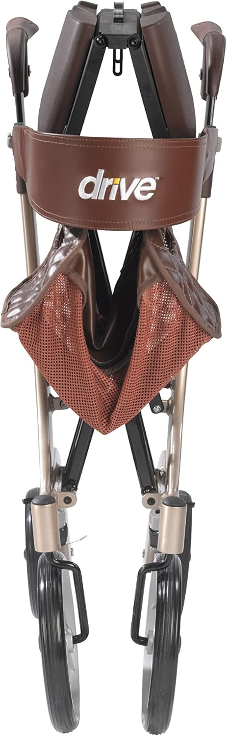 The Drive Medical deluxe Euro-style portable rollator walker with a seat is the ultimate mobility solution that marries advanced features like premium wheels and a hidden brake cable with a handsome and sophisticated exterior. With 10-inch front casters, the 4-wheeled walker steers and rolls with ease over rough terrain and turns on a dime. Its durable and lightweight aluminum frame is strong enough to withstand extended daily use and has a weight capacity of 300 pounds. The portable rollator walker with seat easily collapses to an ultra-compact size with one hand and can be stowed in the trunk or back seat for travel. A quilted storage bag secures all your personal belongings. The handles and removable back are height-adjustable, and the supportive seat is made of dense foam for comfort. Unique cross-brace design allows for side-to-side folding. Available in two colors, the Champagne (brown) option offers a handsome leather-like look to match the Nitro DLX’s sleek Euro design. Completely assembled, these walkers for seniors and adults arrive ready-to-roll. Backed by a limited lifetime warranty from Drive Medical, a leading brand of mobility aids and other medical goods for more than 20 years, you can purchase with confidence.