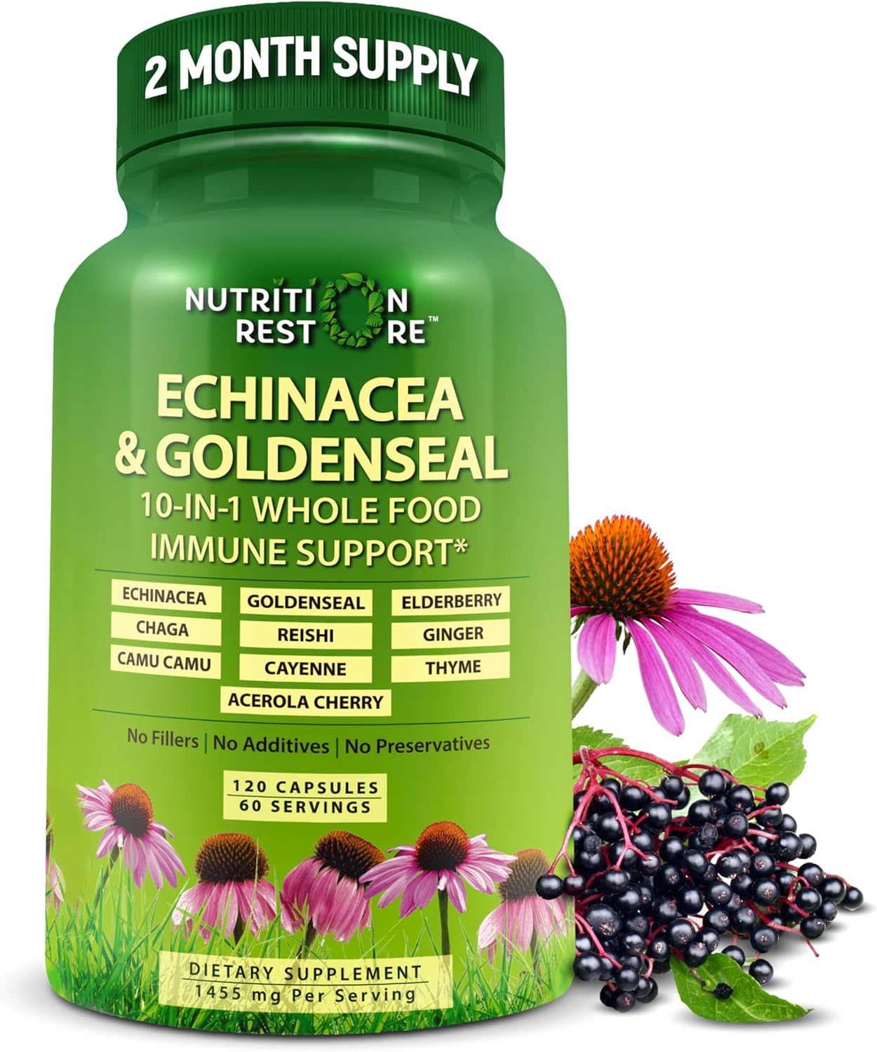 Incredible Two Month Supply in Every Bottle: Every bottle contains organic echinacea purpurea, echinacea angustifolia, black elderberry, chaga mushroom, reishi mushroom, acerola cherry, goldenseal root, camu camu, ginger, thyme, and cayenne pepper.