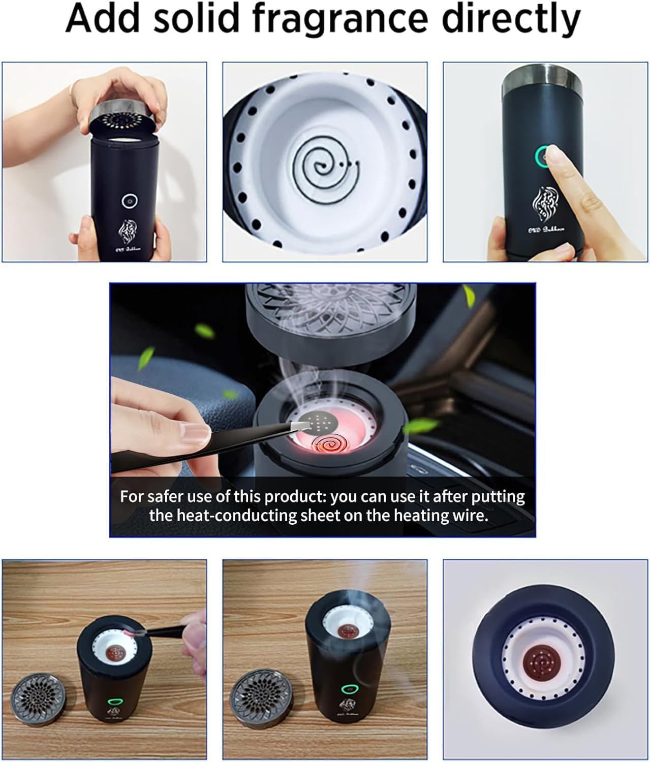 1.Don’t touch the outlet incense chamber and any items near the heating element with your fingers. 2.Don’t leave the product in high temperature or damp conditions. 3.Don’t use the product when there is flammable gas in the air. 4.The product is includes small parts,please keep away from children and pets. 5.Don’t use the product while driving.