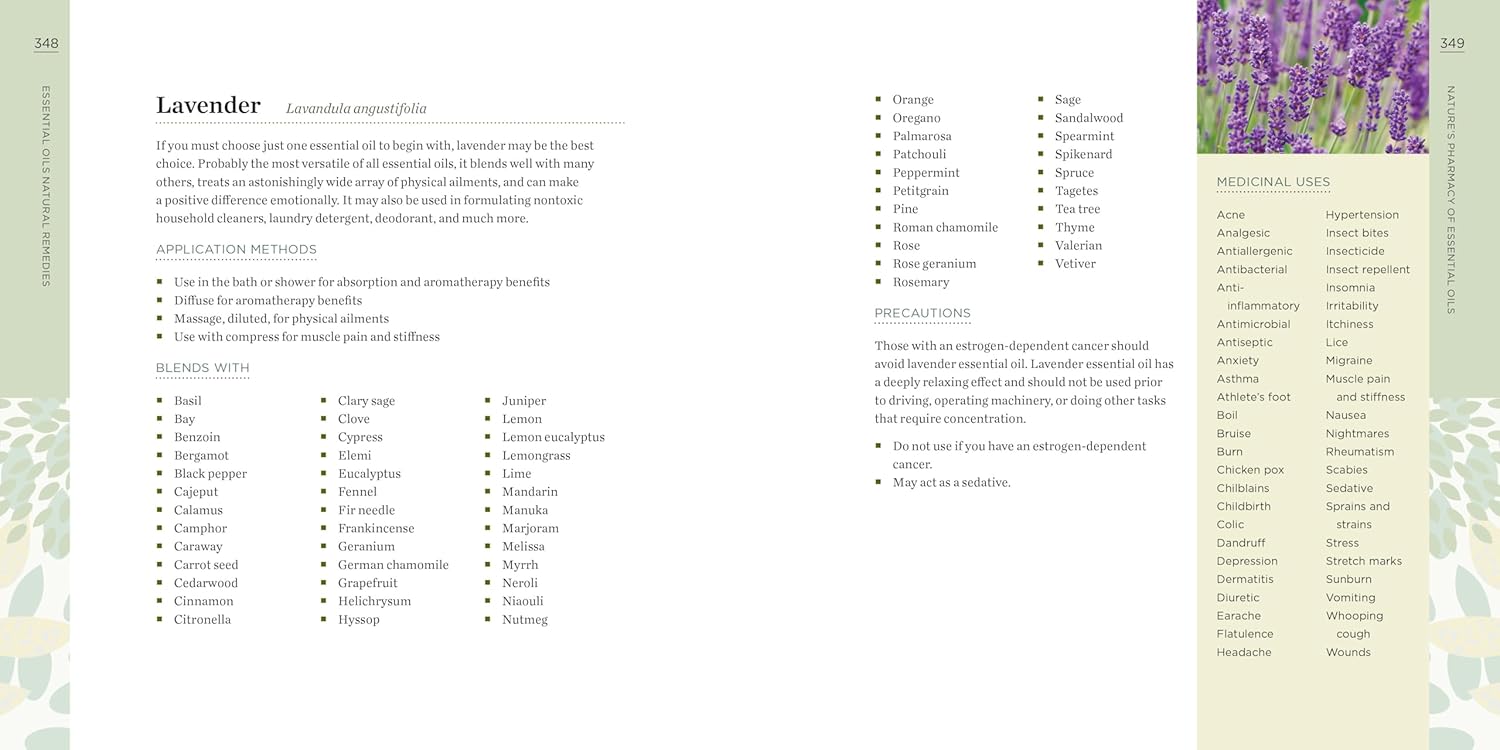 Essential Oils 101—Learn the history of essential oils, how to get started with tools and equipment, plus need-to-know application methods.170 Ailments and 300 Remedies—Use essential oils to help treat common ailments with hundreds of classic remedies.75 Profiles—Get to know all about the most popular essential oils and how to use, apply, and blend them. Precautions are also included.