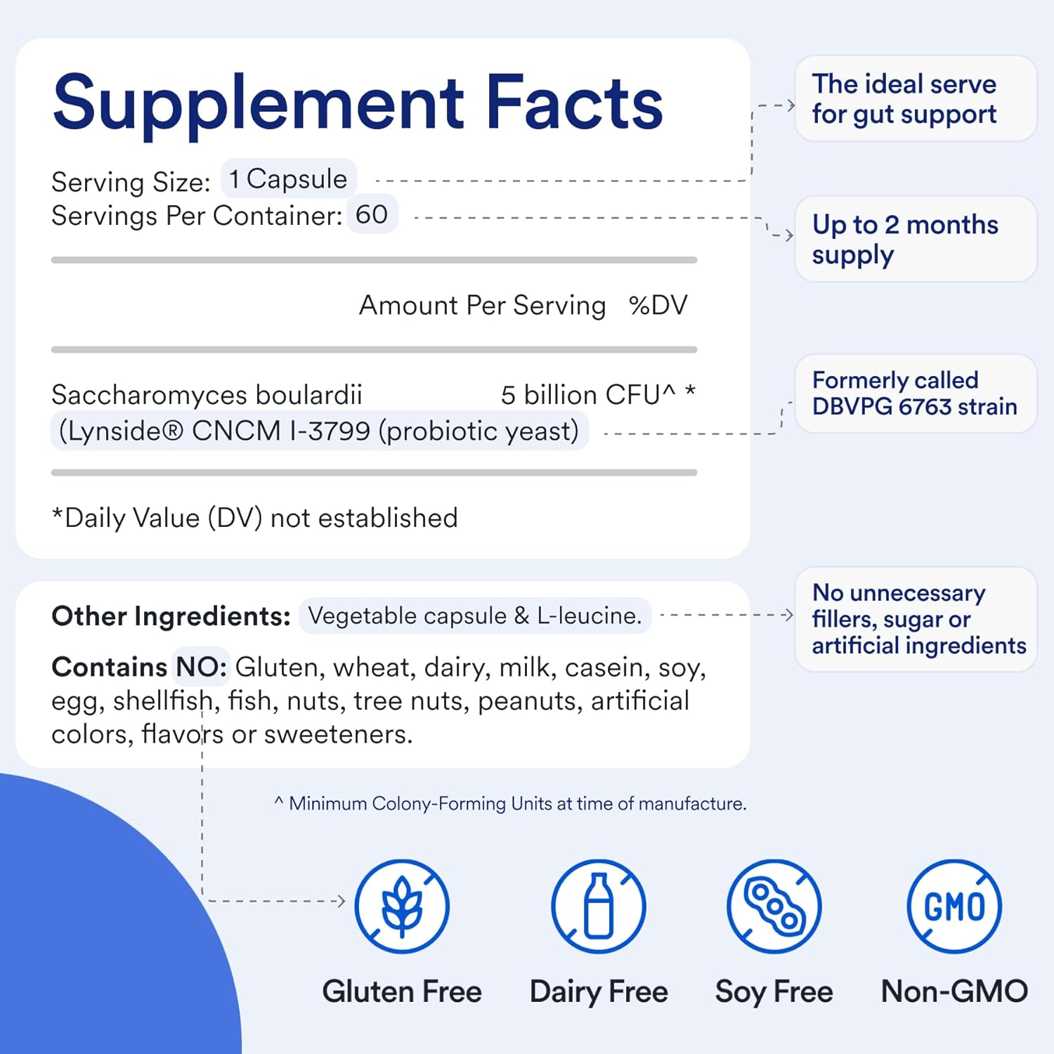 5 Billion CFUs Saccharomyces Boulardii Probiotics: Exclusively made with the strain Lynside CNCM I-3799, formely called DBVPG 6763
