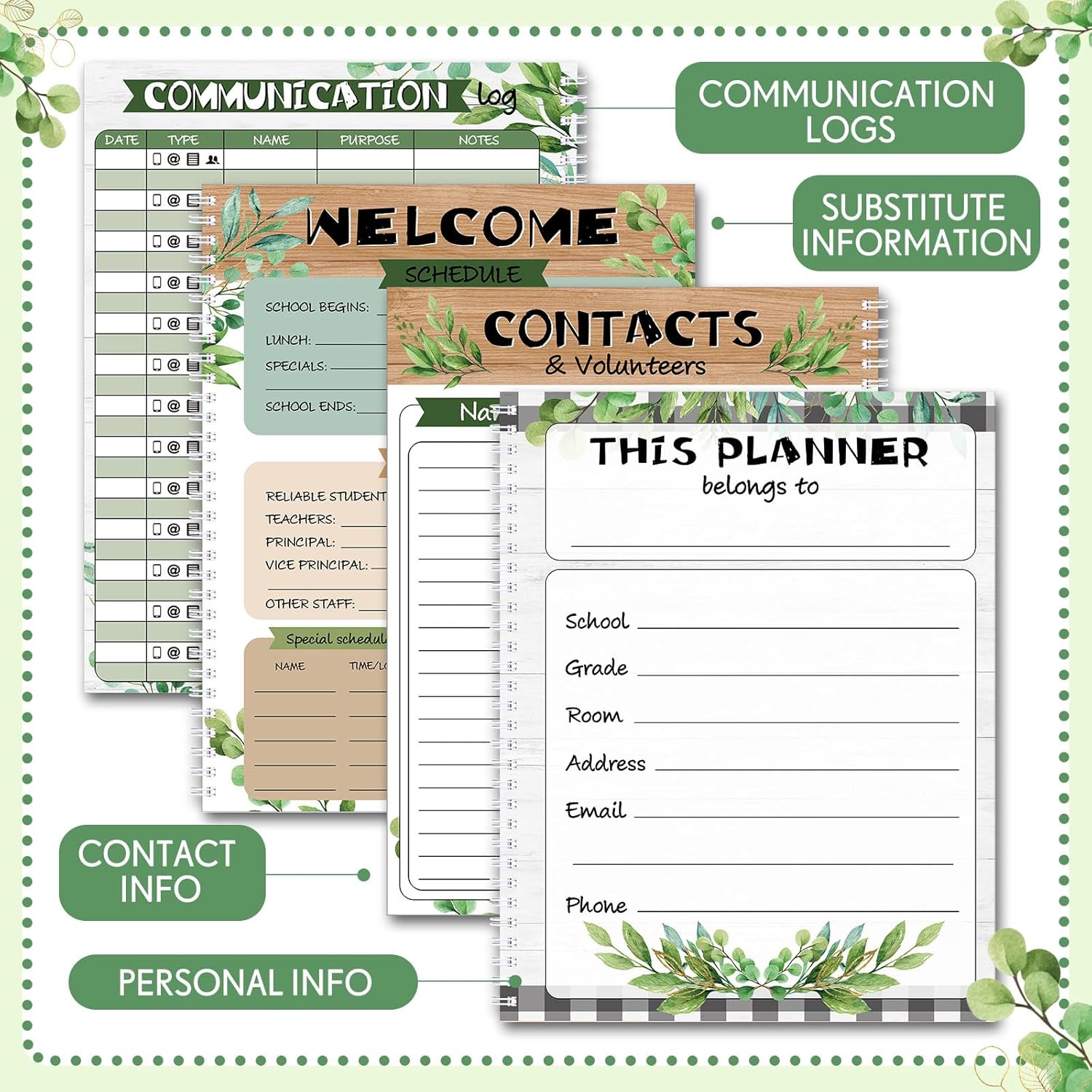 Eucalyptus Theme Teacher Planner: this teacher lesson planner exterior is designed with green eucalyptus plants patterns and gold words[teacher planner] matching white and eye-protection yellow inner page, giving teacher a refreshing feeling; Teacher can use this record checklist to organize student’s grades, attendance, homework completion and formulate monthly/weekly/daily planner or add additional notes