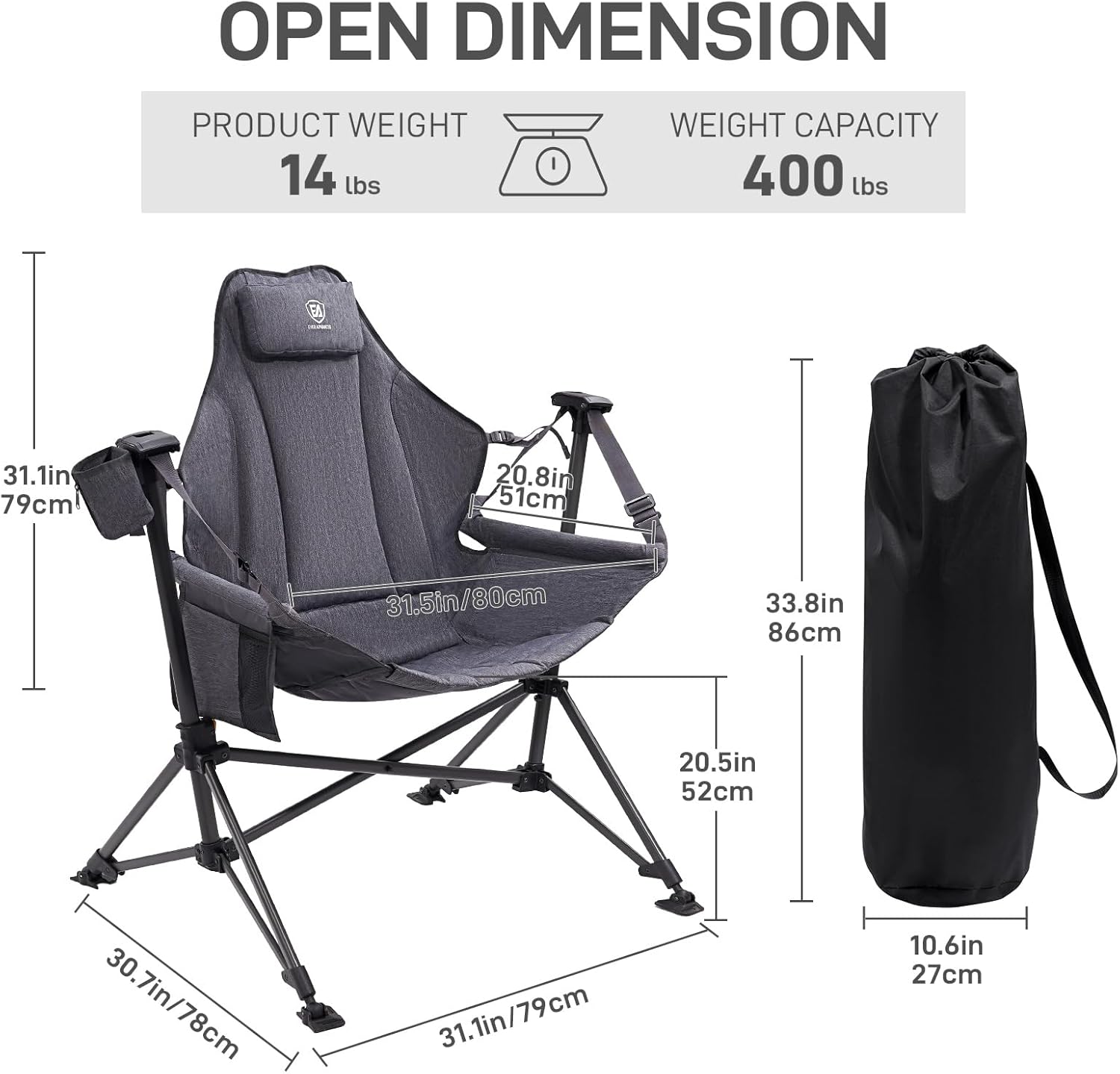 6 reviews for EVER ADVANCED Padded Hammock Camping Chair, Oversized Heavy Duty Swing Chair with Detachable Cup Holder, Portable Folding Rocking Camping Chair for Outdoor&Indoor, Support Up to 400lbs, Grey