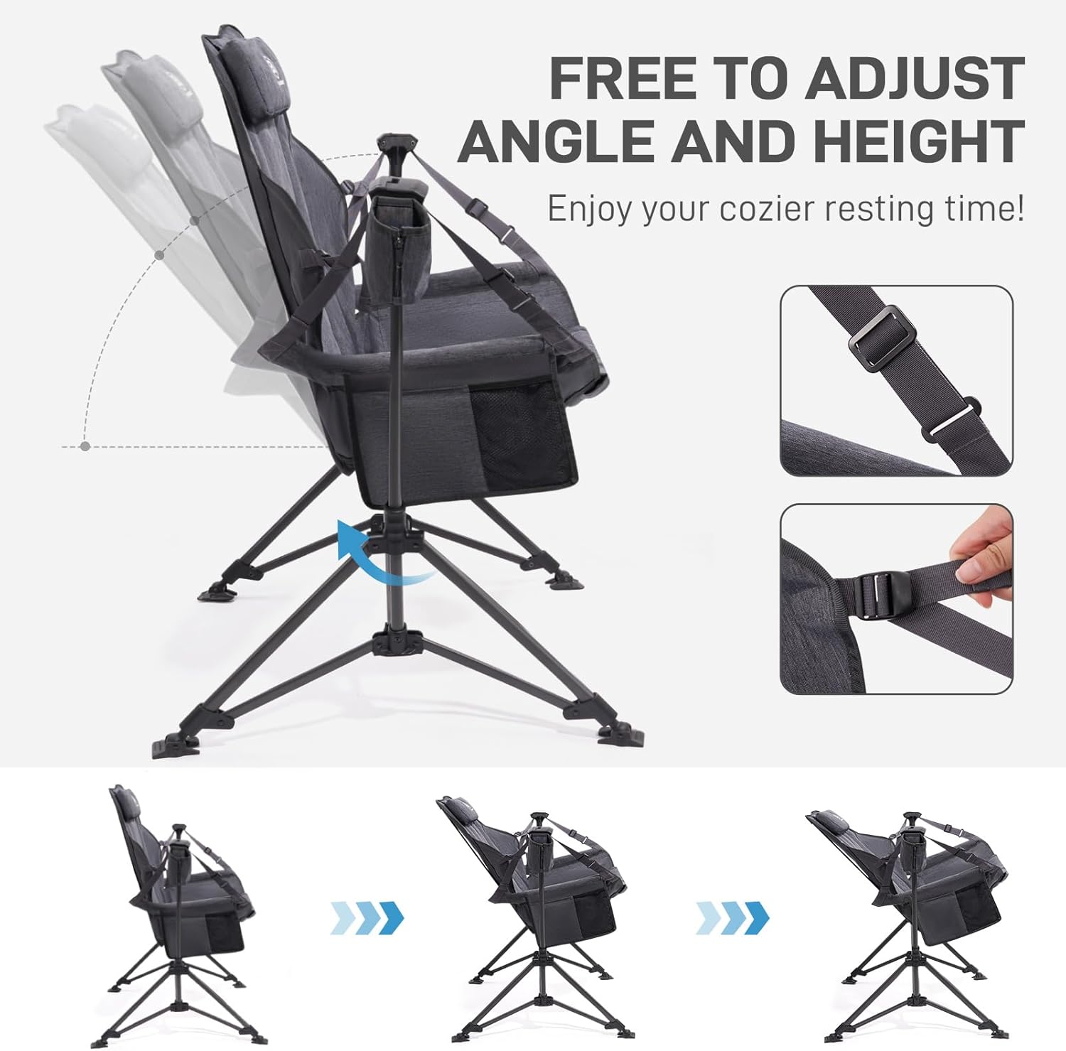 【Adjustable Design】: This camping swing chair’s seat height and backrest angle can be easily adjusted to your liking. Put your hands on the side armrests and you can enjoy a relaxing rocking time anywhere you want. Comes with a detachable cup holder,you can place it on the left or right side depending on your preferences.