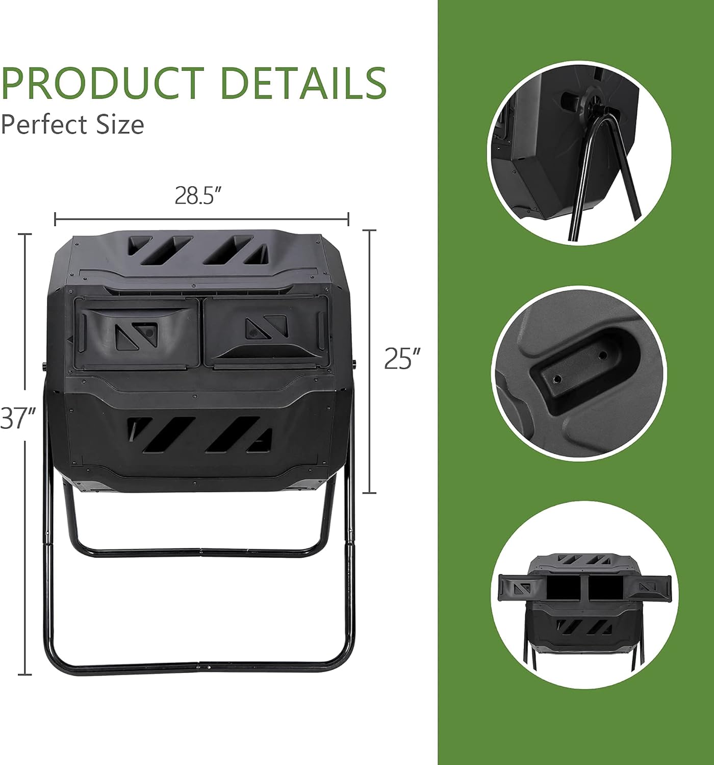【Convenience Aeration System】–The strong compost barrel features aeration holes as well as deep fins to break up clumps inside the chamber and mix lots of oxygen into the compost, please make sure that you have all the tabs in the holes as well or the panel won’t make a flat seam. Easy to use as the openings are divided, just slide the door open to add the compost material and slide shut