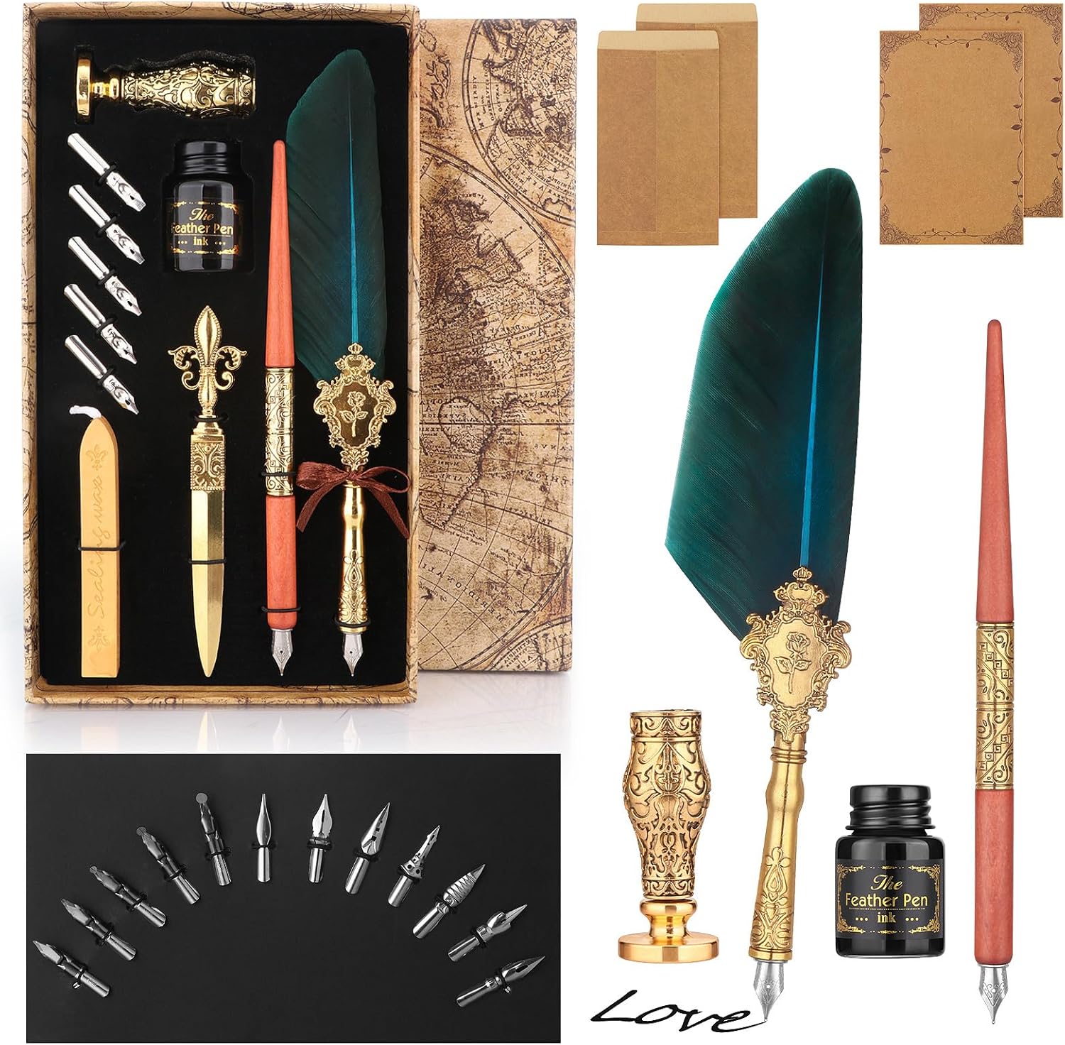 Feather Pen 27 Pcs Quill Pen and Ink Set Calligraphy Pens Set Fountain Pen with 2 Pens,17 Nibs,Wax Seal Stamp,Ink,Holder,Letter Writing Kit Calligraphy Kits for Beginners-Gift for Calligraphy Lovers