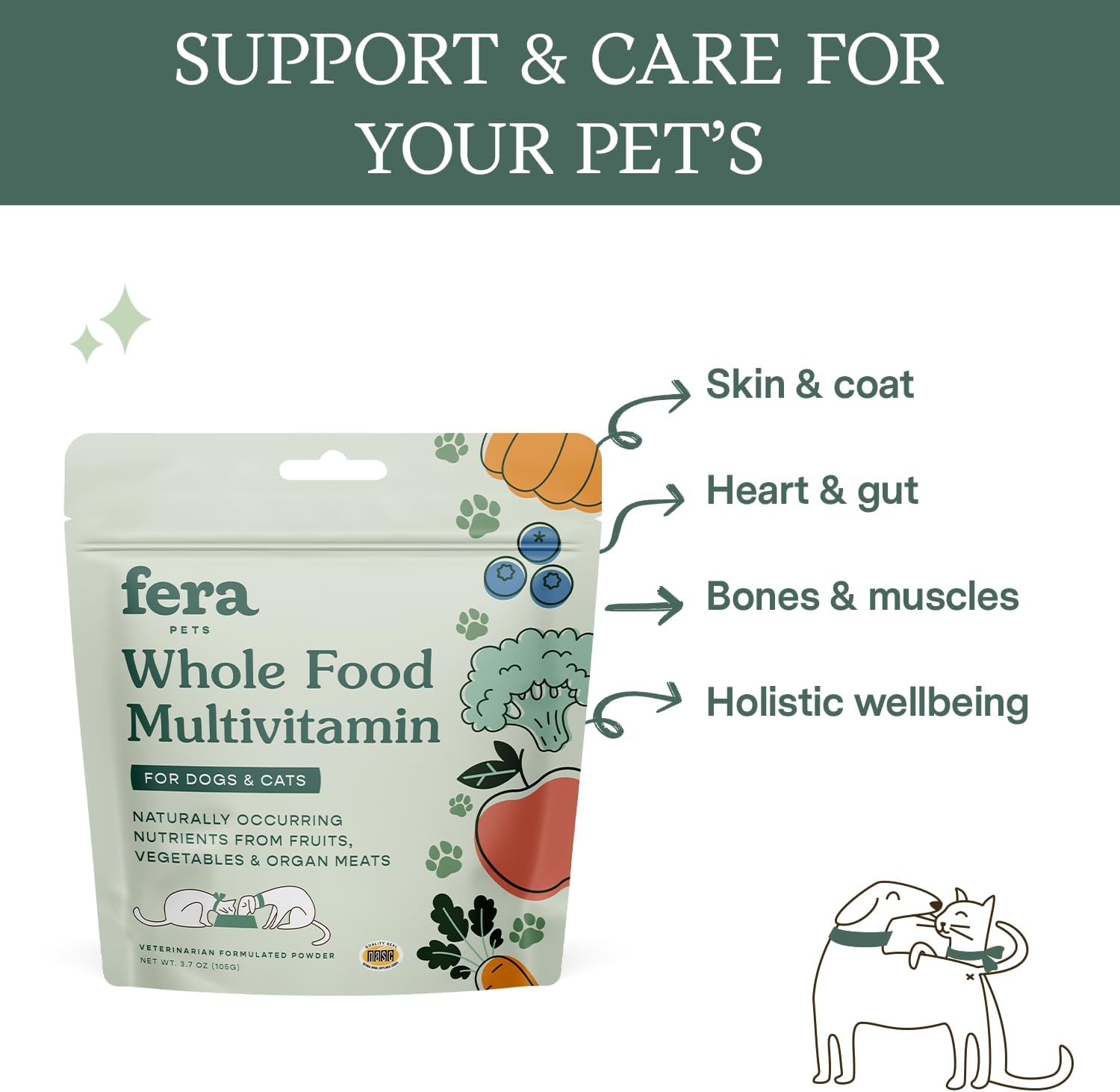 Whole body wellness blend: Fera’s Whole Food Multivitamin for dogs and cats is made from carefully selected, minimally processed ingredients to optimize their bioavailability and nutrient absorption; complements kibble, raw or fresh dog food or cat food
